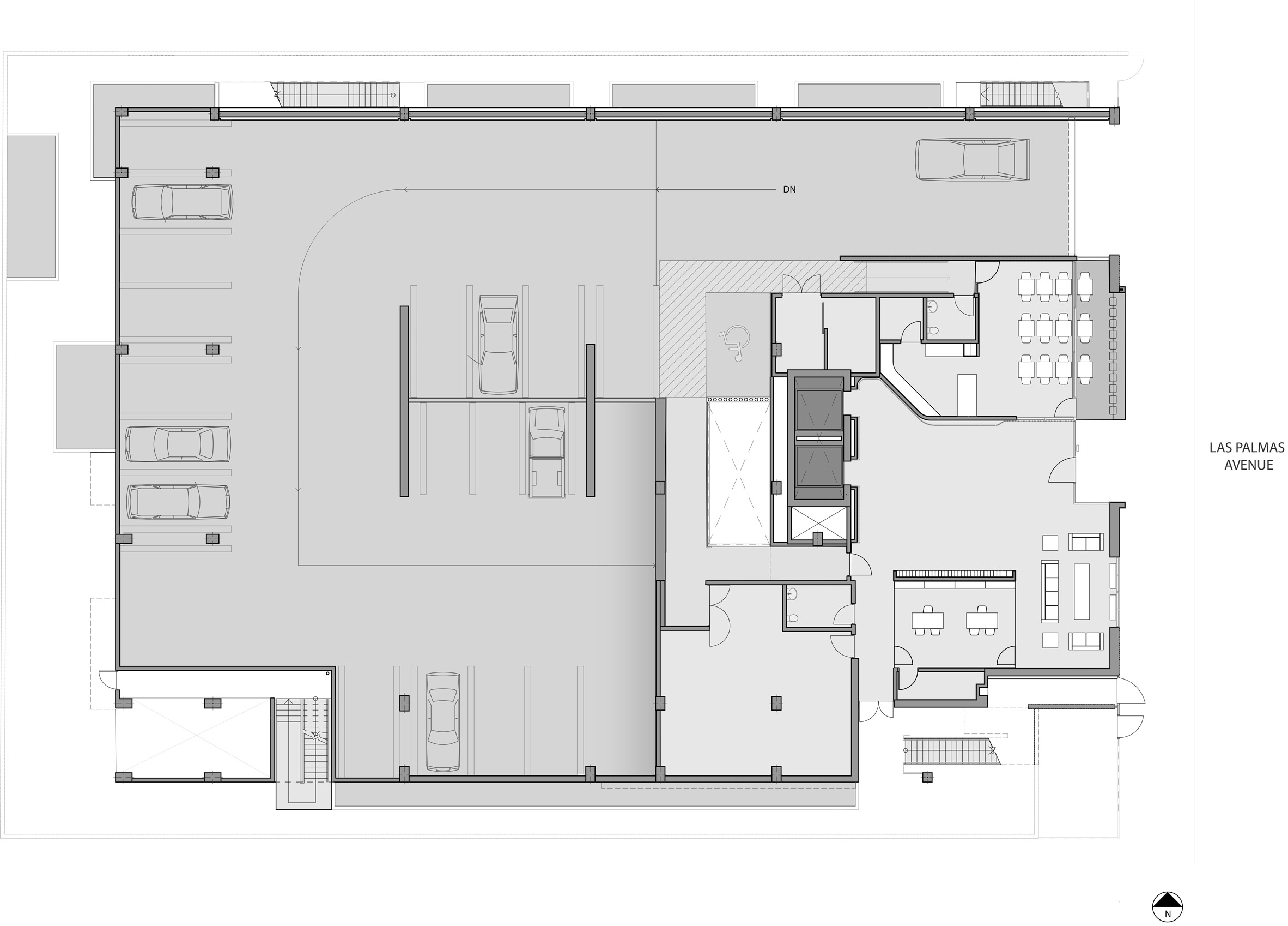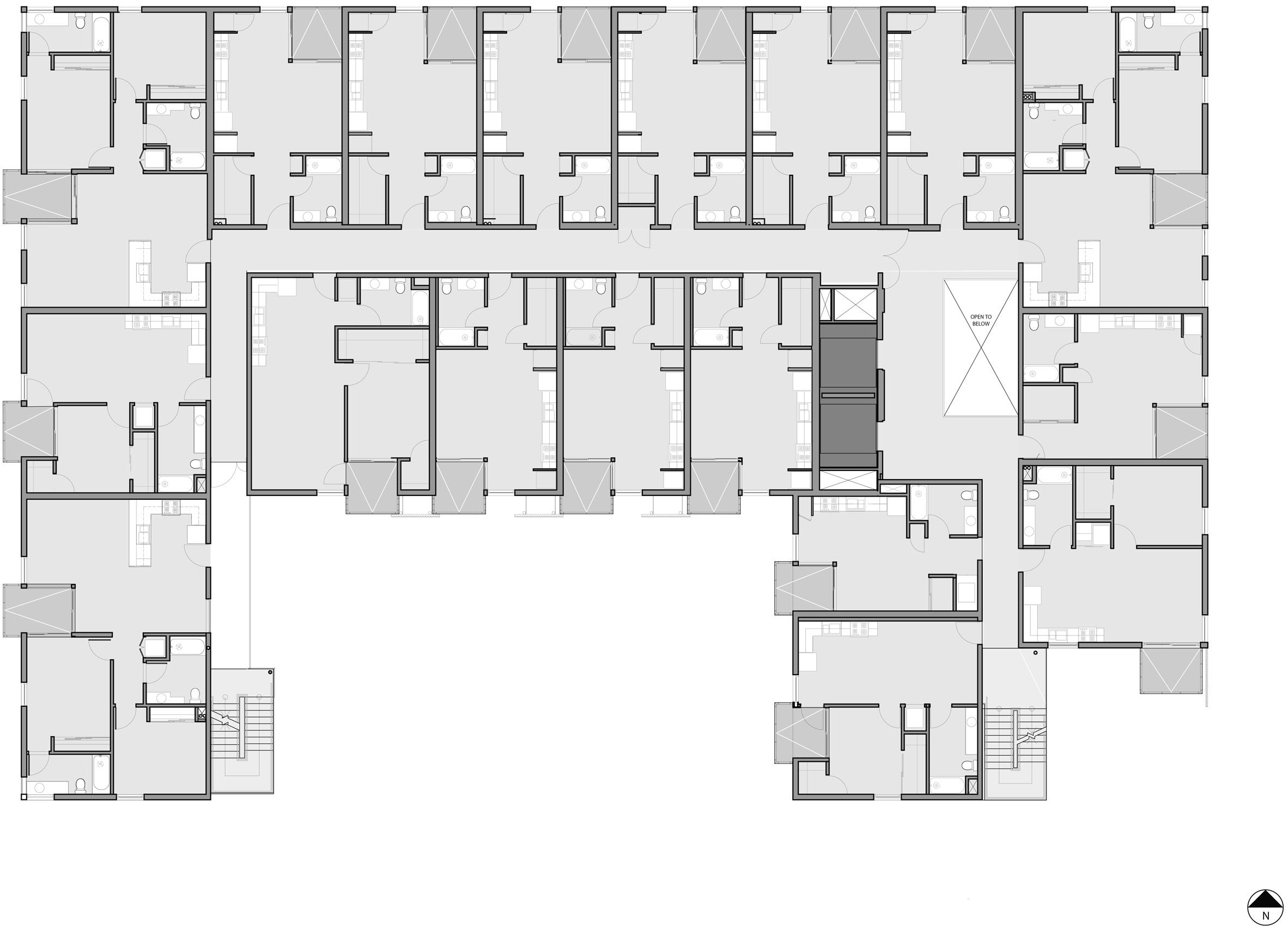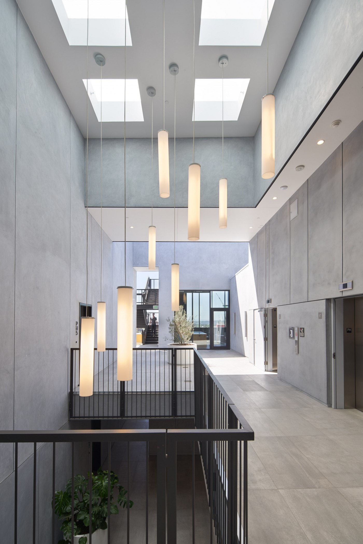他们创造了直线形式,围绕着酒店南侧的露天庭院布置成曲线。该团队并没有整合一个连接所有楼层的楼梯间,而是在整个计划中穿插楼梯。一楼设有1,100平方英尺(102平方米)的零售空间