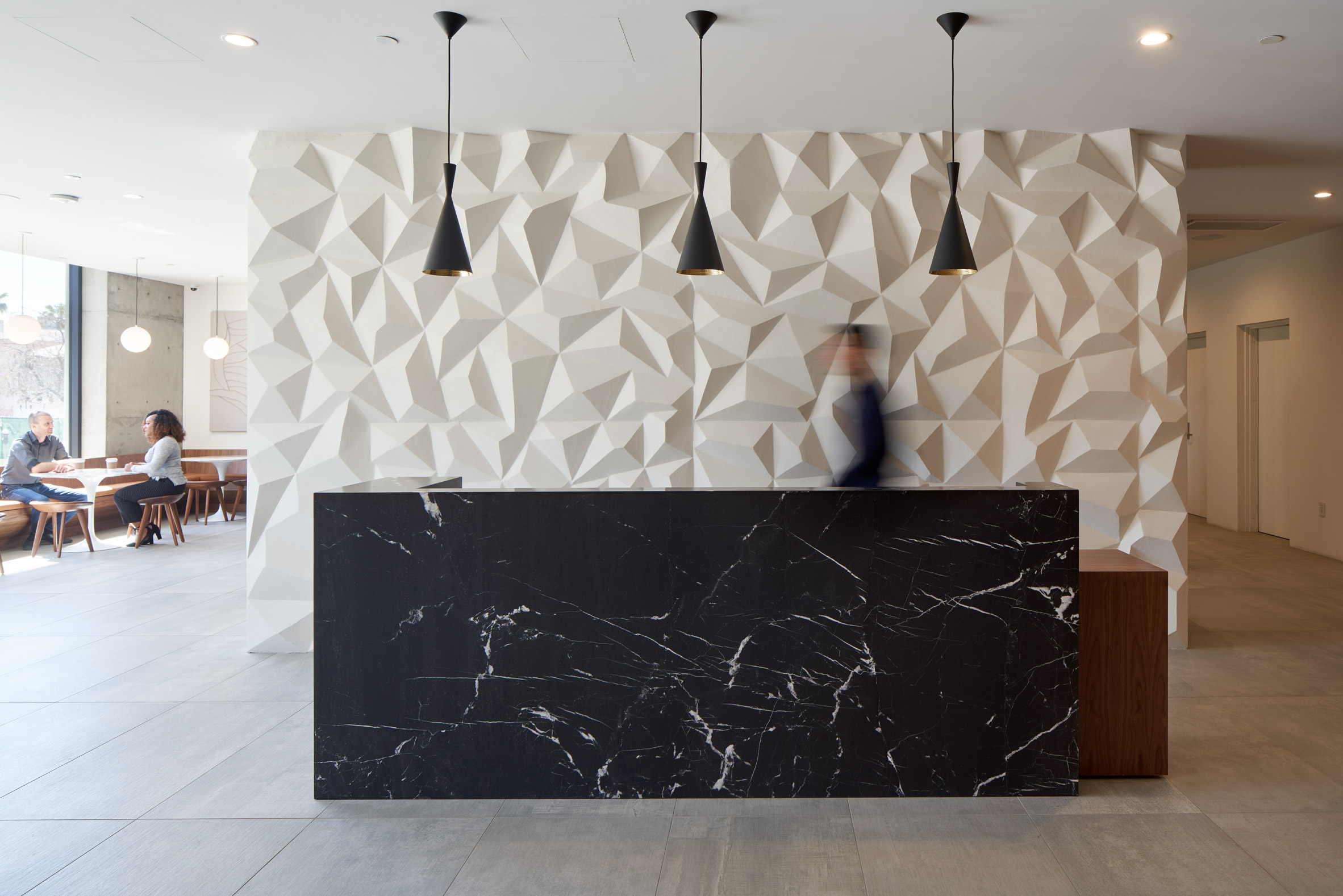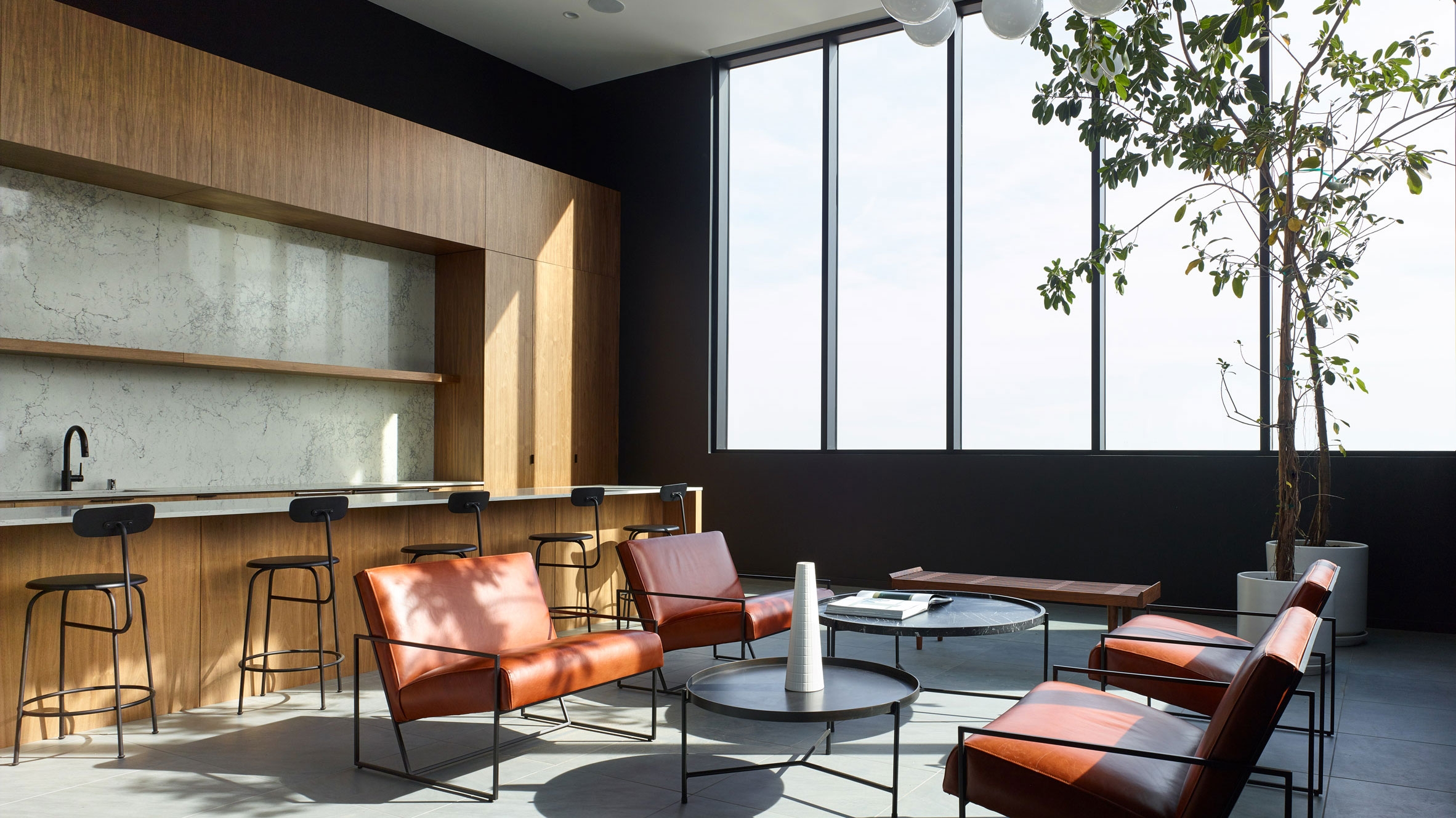 一系列设施旨在扩大租户的生活空间和培养社区,例如带有手工咖啡的工作区,大堂的吧台,娱乐室和温水游泳池。该建筑顶部设有天空休息室,可欣赏到好莱坞山和洛杉矶天际线的美景。