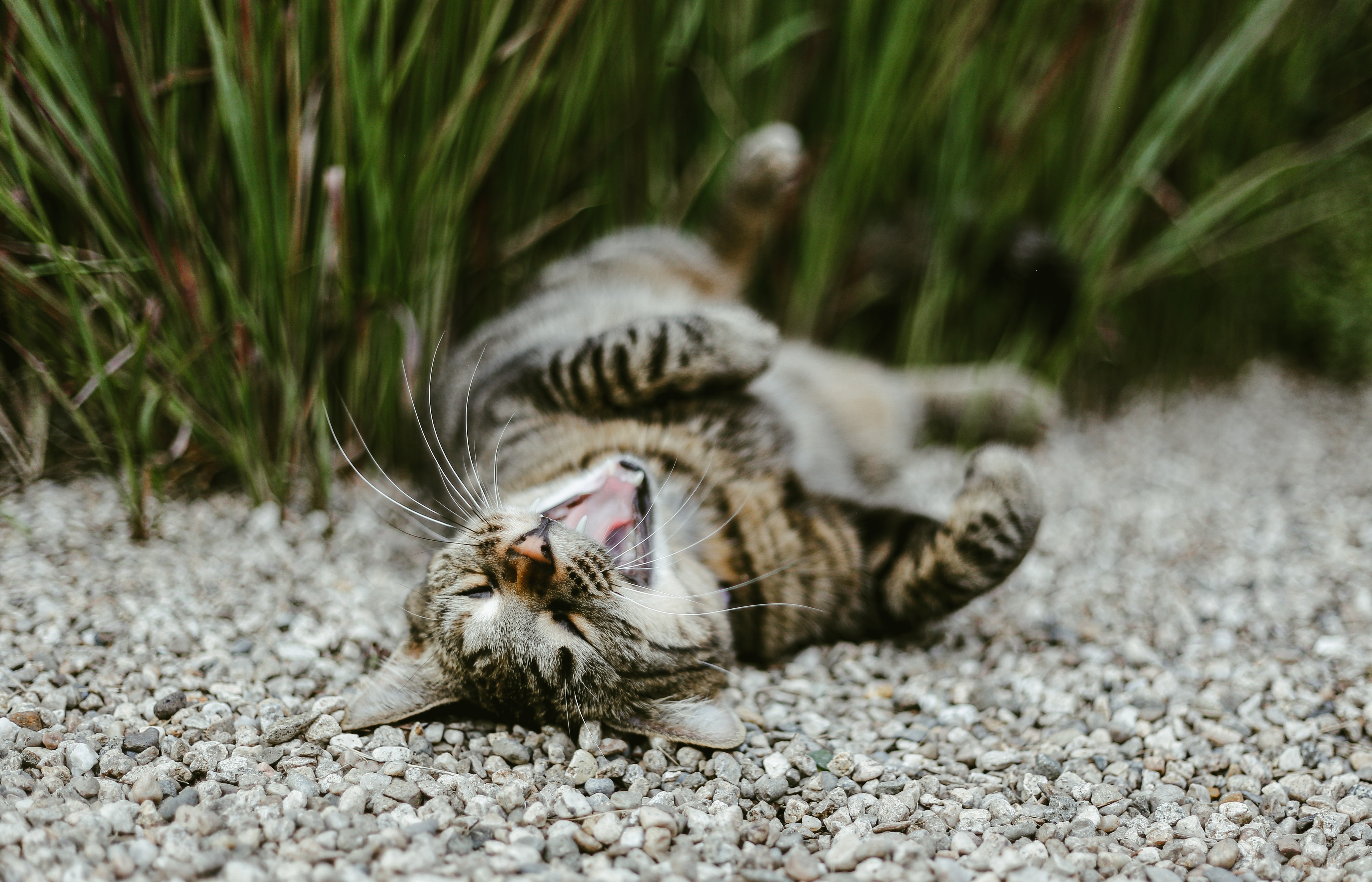1 张 躺在砂砾中玩耍的灰色家猫