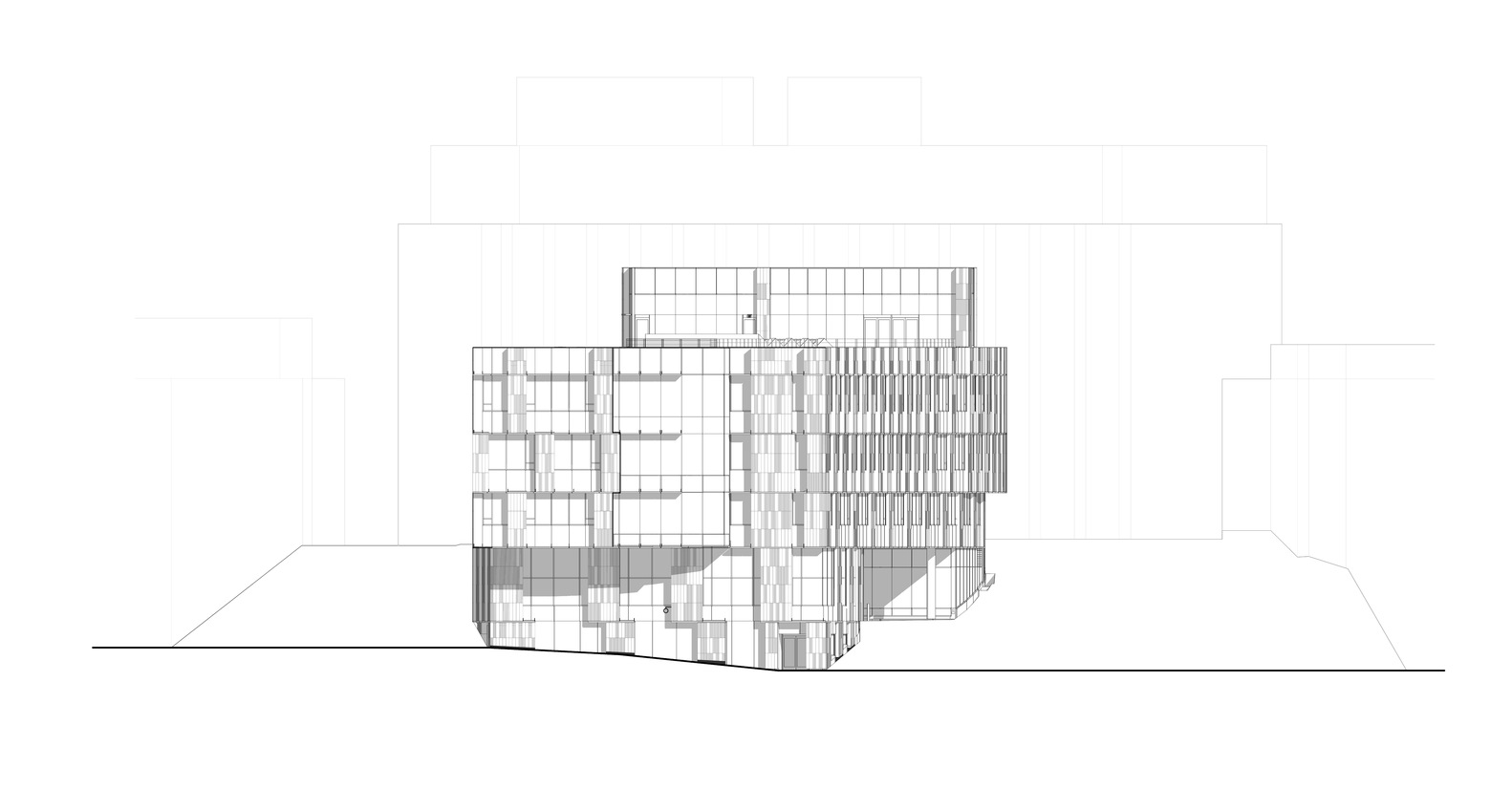 该建筑旨在丰富其周边地区活动,并促进其与校园社区的更广泛连接。咖啡馆激活了史蒂文斯路的主要入口,从外部景观过渡到充满天光的中庭,并在视觉上和流线上连接所有楼层和功能空间。共享广场沿着一系列阶梯式立面布置,为建筑北侧提供了多个入口,既保证了通向中庭的开放流线,又利用巨石和植被重新界定了人行路线。