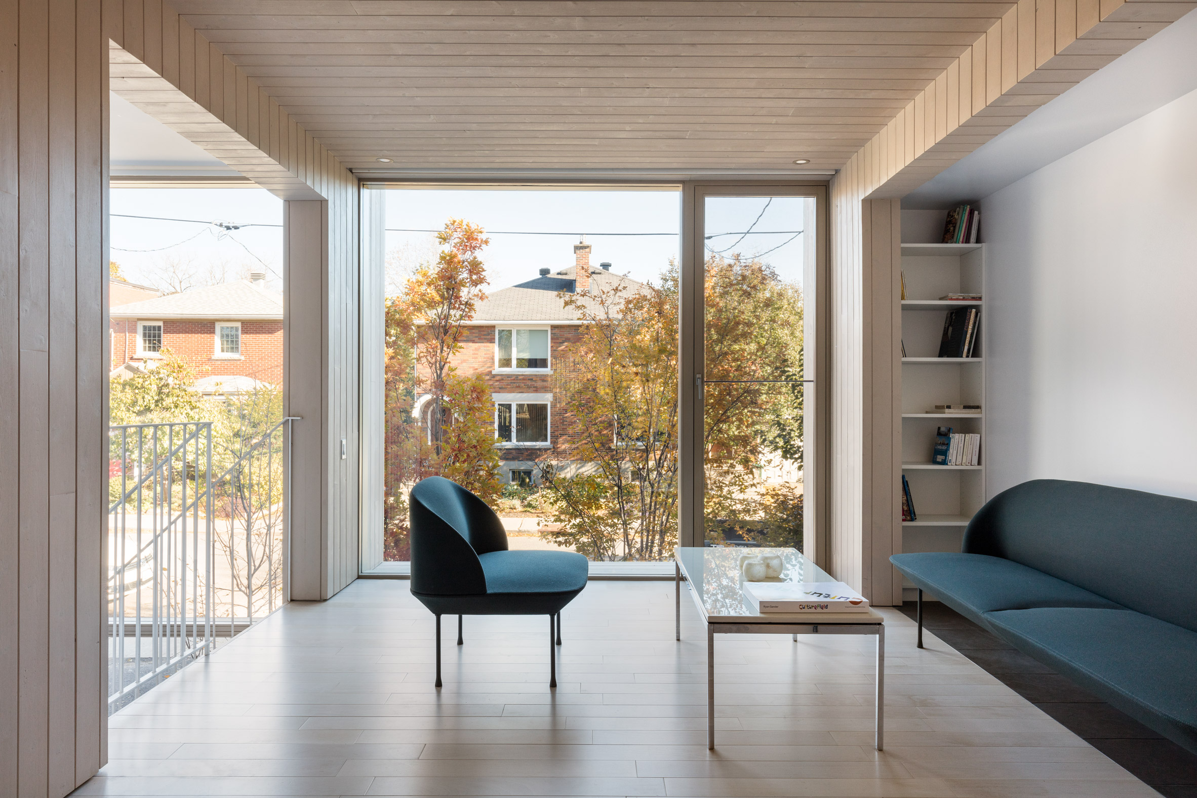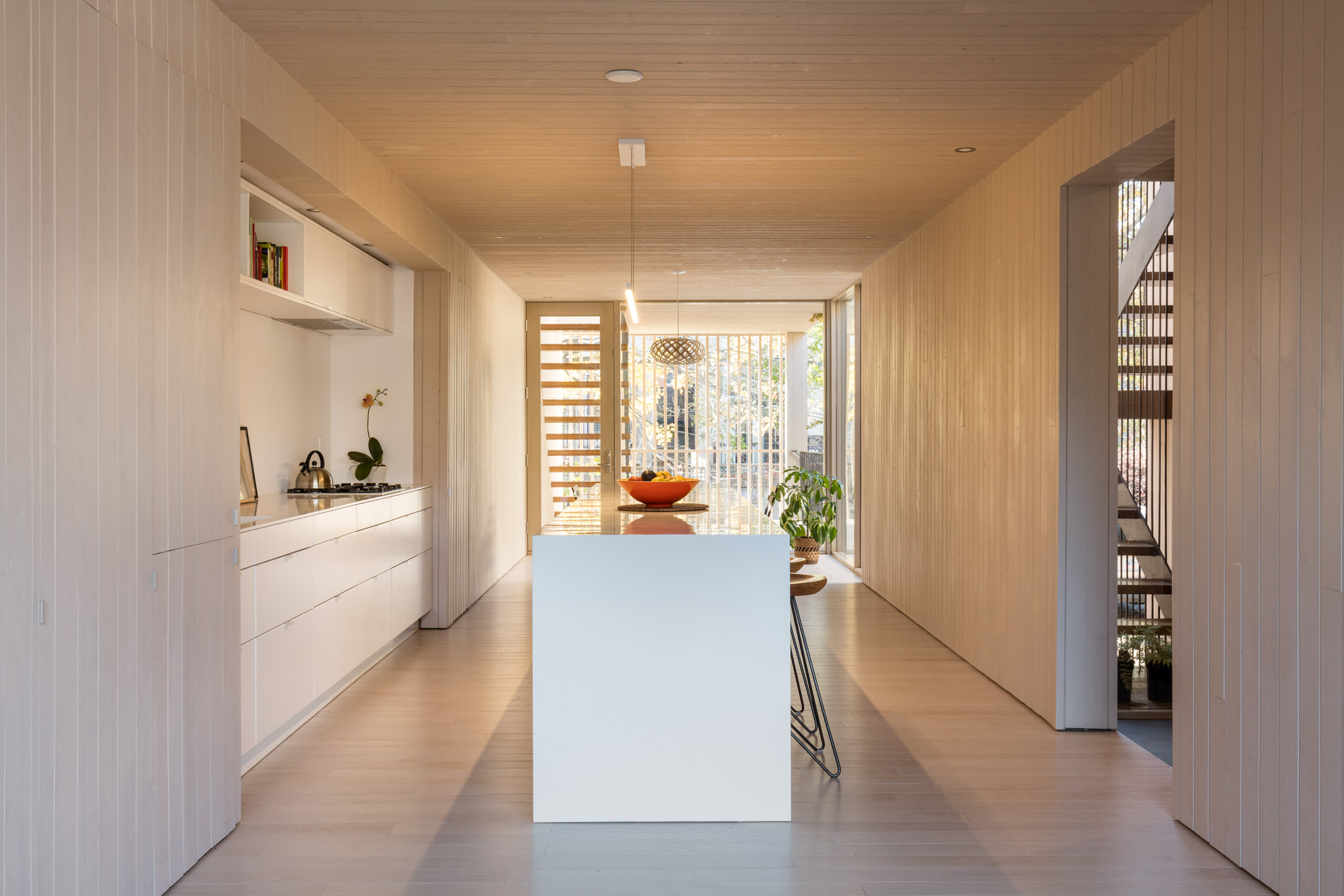 主入口通向一个开放式起居空间,包含厨房和用餐区。在家的前面,一个小型研究俯瞰下面的街道。