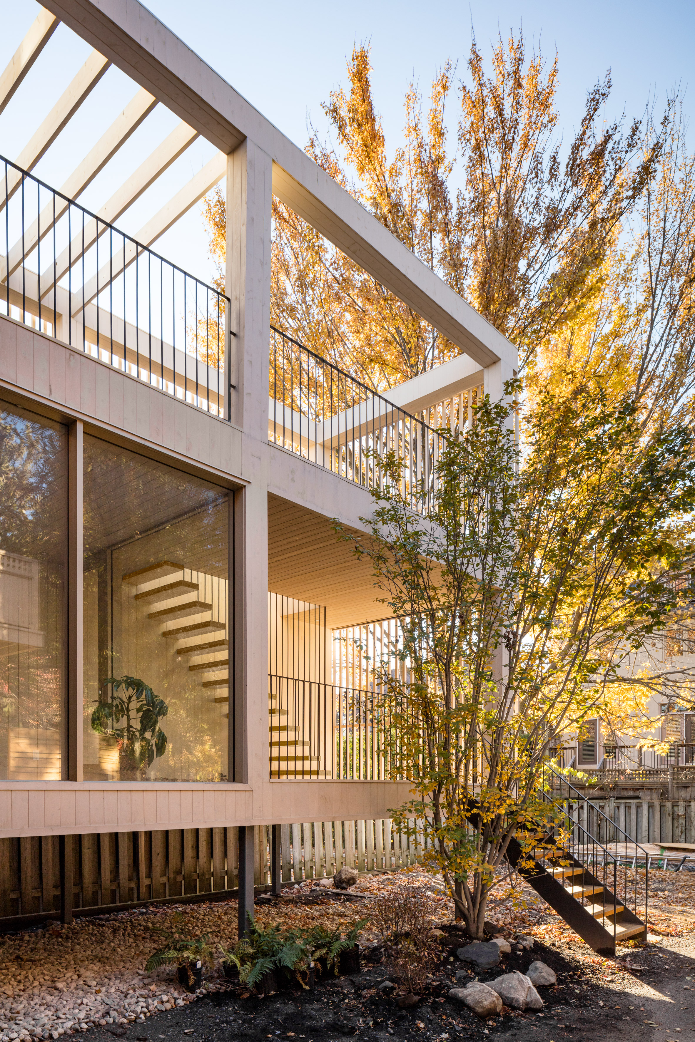 木制露台占据了建筑物后面的三层楼,为所有居民提供了户外空间。它由木质格子部分遮蔽,旨在为种植葡萄藤提供框架。