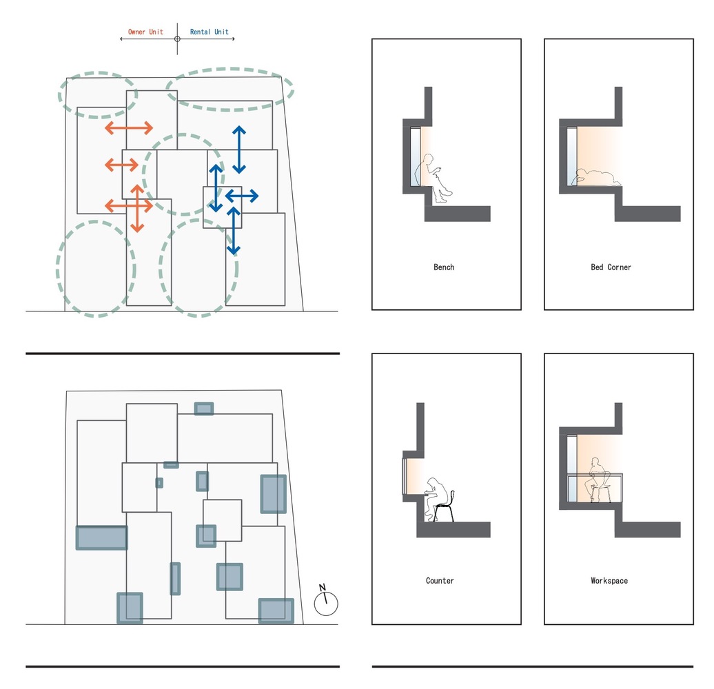 每个单元由相互联系的方形房间组成。这些单元排列成行,在各组单元之间,有一条类似通道的“边缘庭院”,用于调和居民们不同的价值观和生活方式。另外,一系列的小盒子被依附到每个大盒子上。这些小盒子作为凸窗,长椅,柜台,阳台和各种小房间,将庭院中南边的光线带入每个房间深处。住宅中开口的高度和方向被偏移过,可以防止邻居看到对方的居住空间。