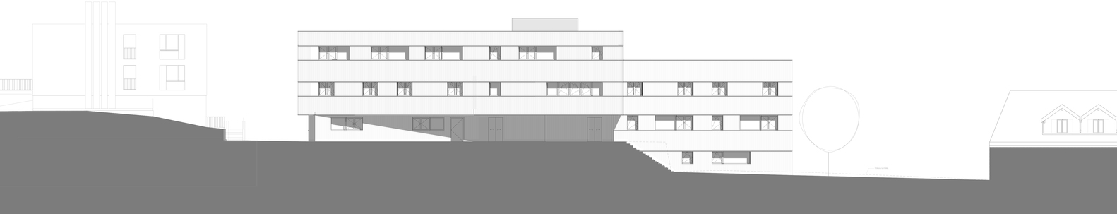 功能规划旨在在一栋建筑中容纳不同的功能。一些功能包括专为需要医疗看护的人设计的治疗场所或多用途房间或车间