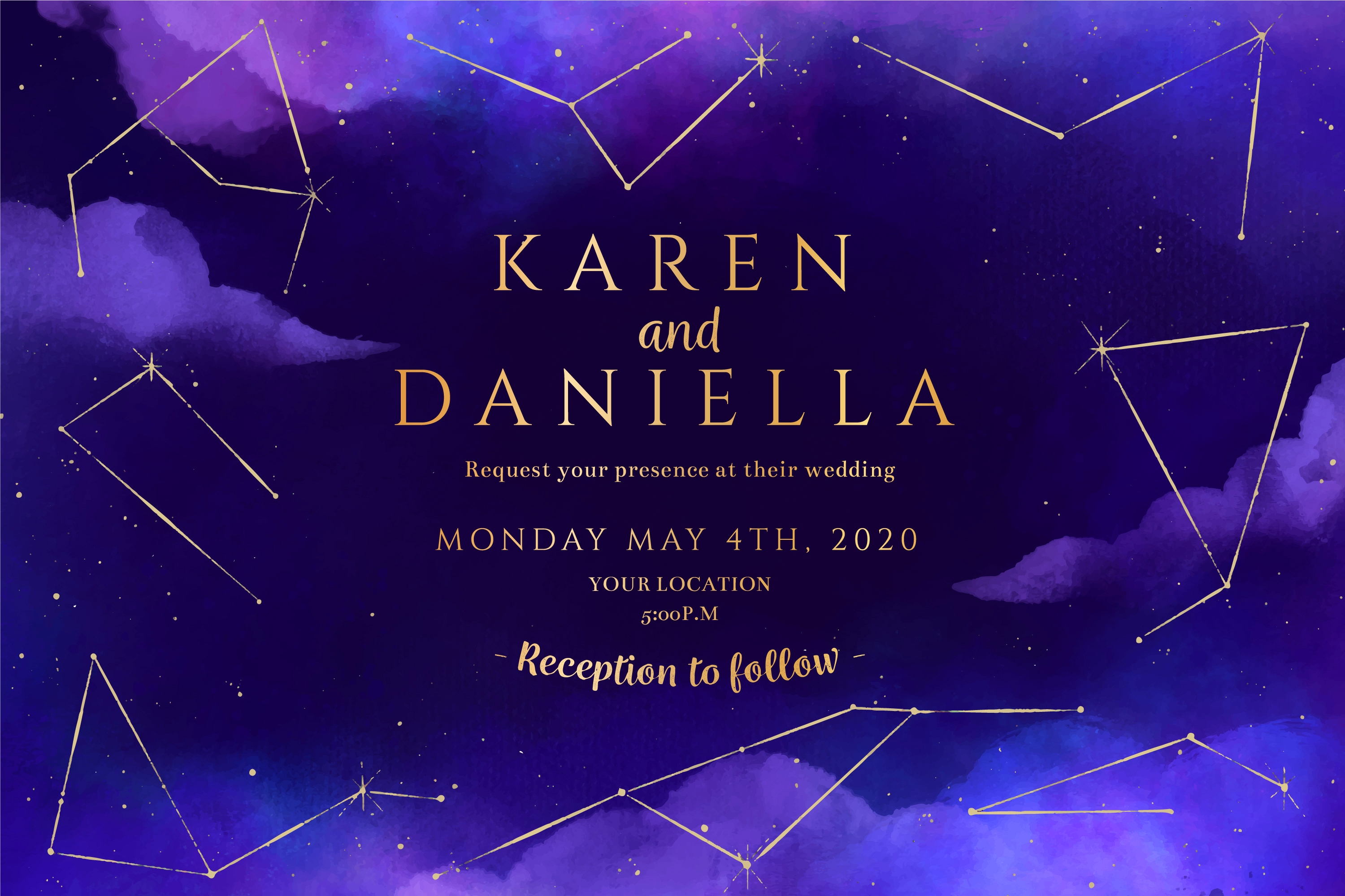 1 张 紫蓝色水彩银河线条婚礼邀请模板