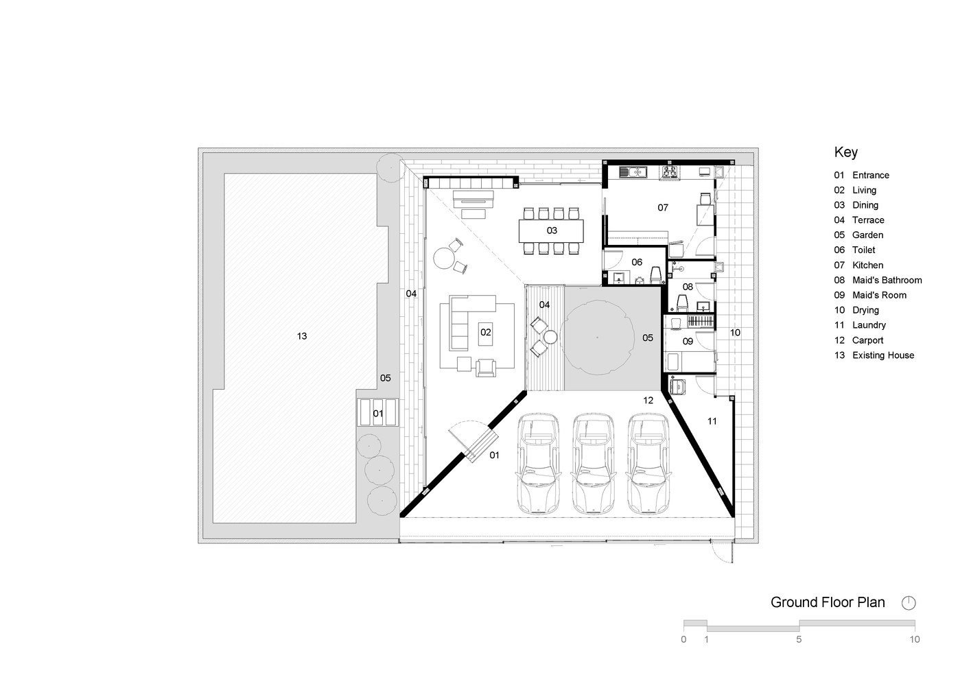 中央的中庭同时也是屋内每一个不同功能的中心点。此外它还是一个将室内外连接的通风空间。尽管如此它能够通过大面积的墙体保护屋内的隐私。屋子正面的墙体就互相向内倾斜。正因如此可以说屋顶之家是受热带风格启发的。