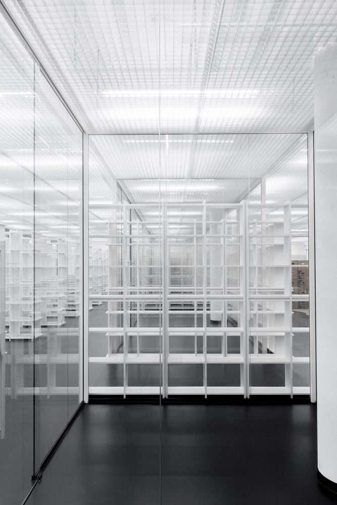 蒙德里安画作中融合网格的主题,通过该图书馆空间中的书架和天花板被三维地展现了出来。其由优质的阳极氧化铝制成的,开放编织网格式结构的天花板,与其结构中必要但几乎看不见的天花板结合,呼应设计主题,与照明一起,产生了各式各样的光线反射效果。同时,通过空间内半透明的玻璃,这种视线的把控与玻璃和书架的光线相结合,使得这种反射效果在私密的区域也同样适用。这样,图书馆不仅能够以一种大气的方式实现所有的功能要求,而且还以自由和秩序的理念,升华了大学以培养警察和管理人员为主的教学主题。管理员霍尔格尼姆茨(Holger Nimtz)也赞誉了该图书馆为:”这座新建筑的瑰宝。”
