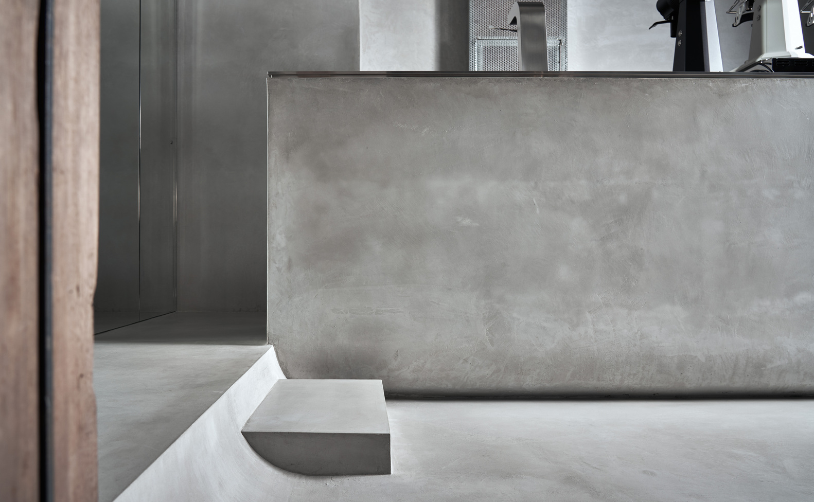 另外我们在空间中的风化木上结合展示功能,弯曲的地景则摆放可随需求移动的座位。客人散坐与风化木及仙人掌的包围之中,正对着隆起的咖啡吧台,观赏着咖啡师在空间中的演出