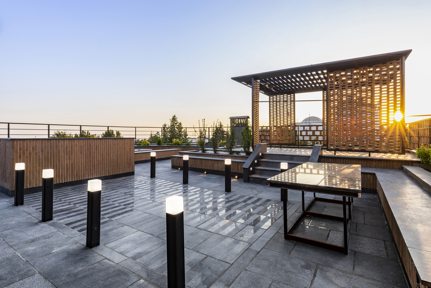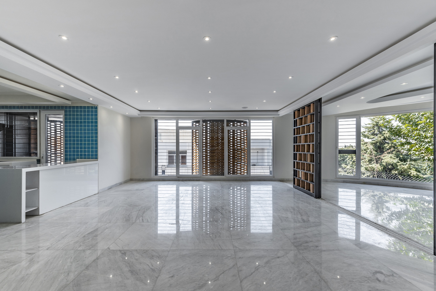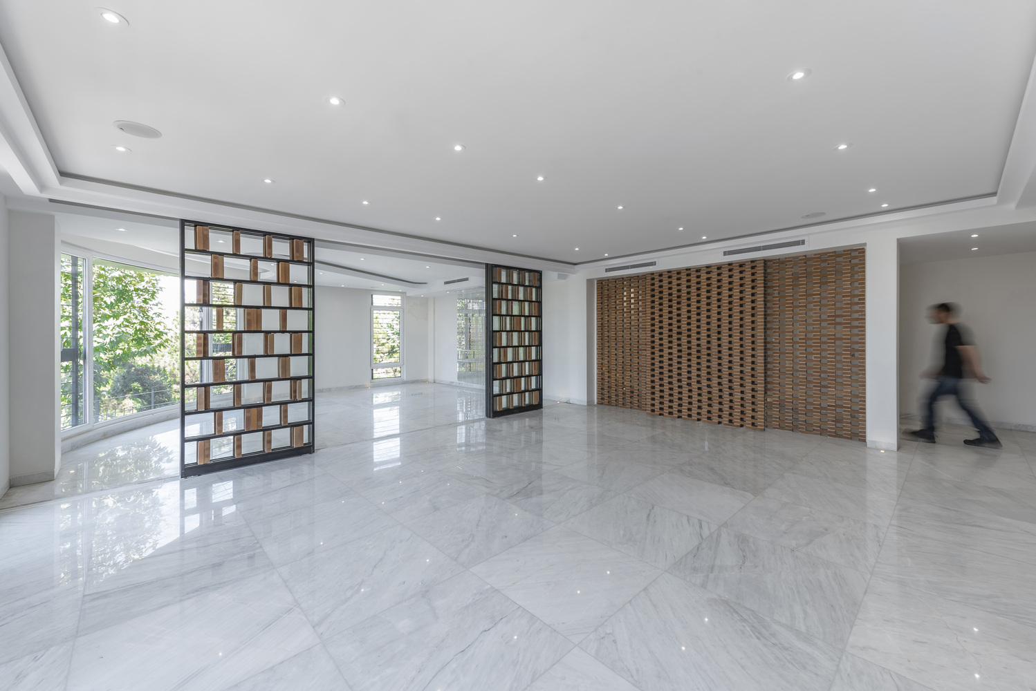 具体来说,建筑师采用了弧形的立面面板,并借助参数化的图形方式,使得私宅在拥有充分开口的同时,依旧可以保有内部空间的私密性。而住宅的居住者却可以轻松地望向窗外的绿地和西侧的群房。总的来说,建筑师在私宅视线控制上的设计,主要关注于保证私密性的同时,满足内部住户的休闲需求。而这种保证私密性的设计手法,还在一定程度上贴合了伊朗习俗中对气候的关注与考量。