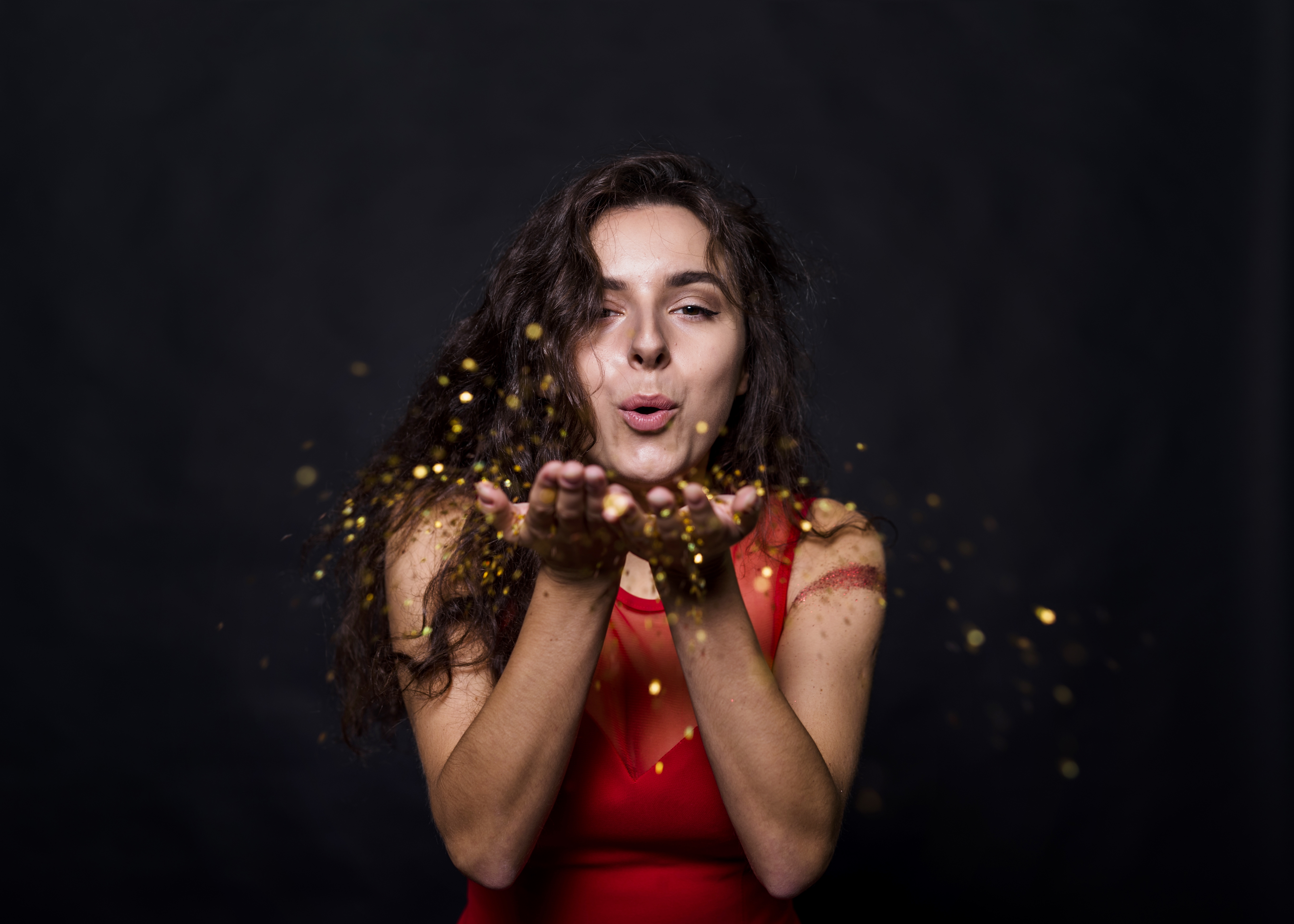 1 张 吹金色纸屑的卷发女子