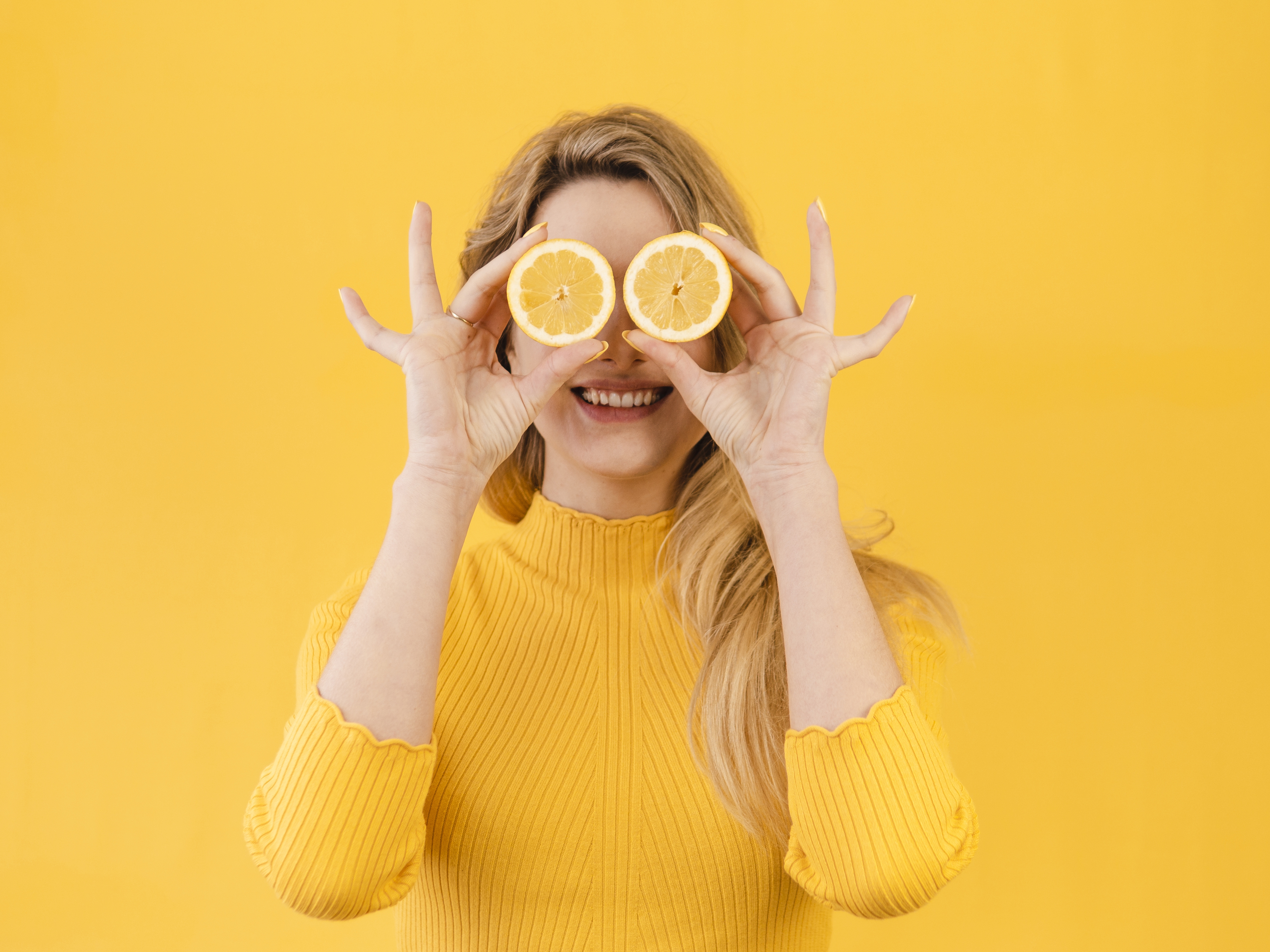 1 张 用脐橙遮住眼睛的金发女郎
