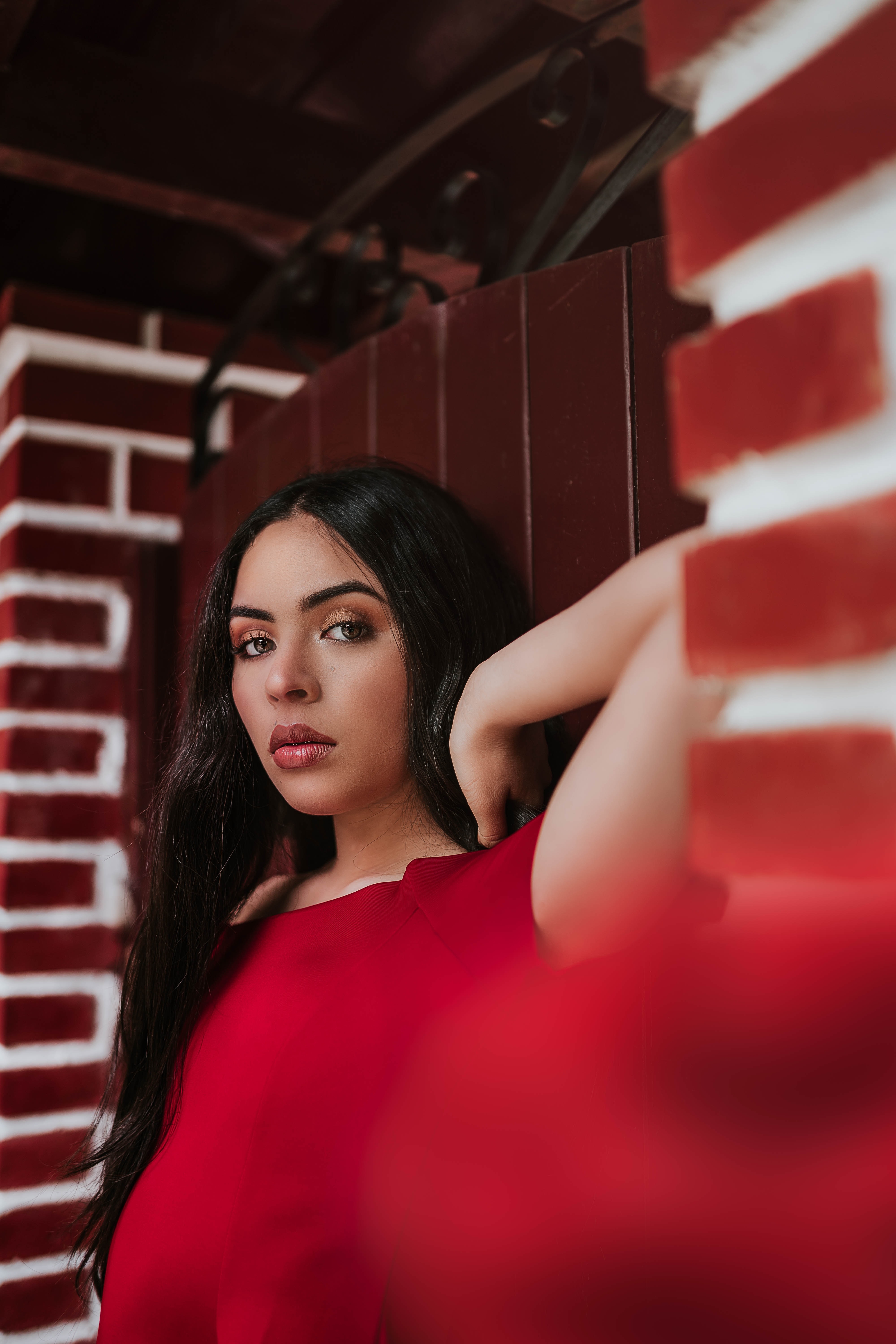 1 张 靠墙的红衣卷发美女
