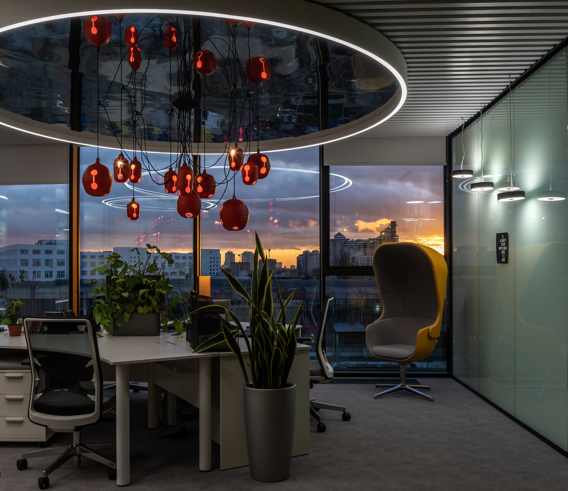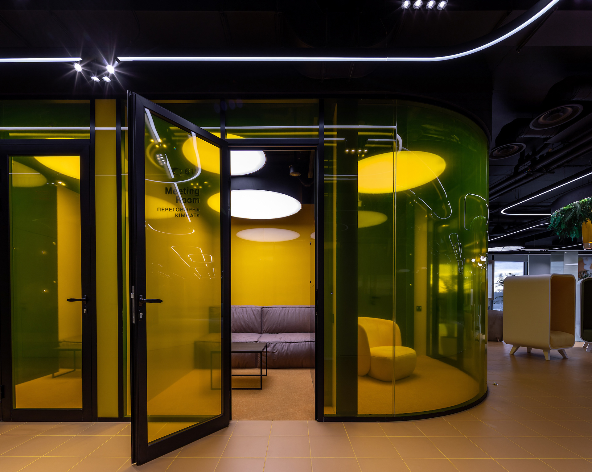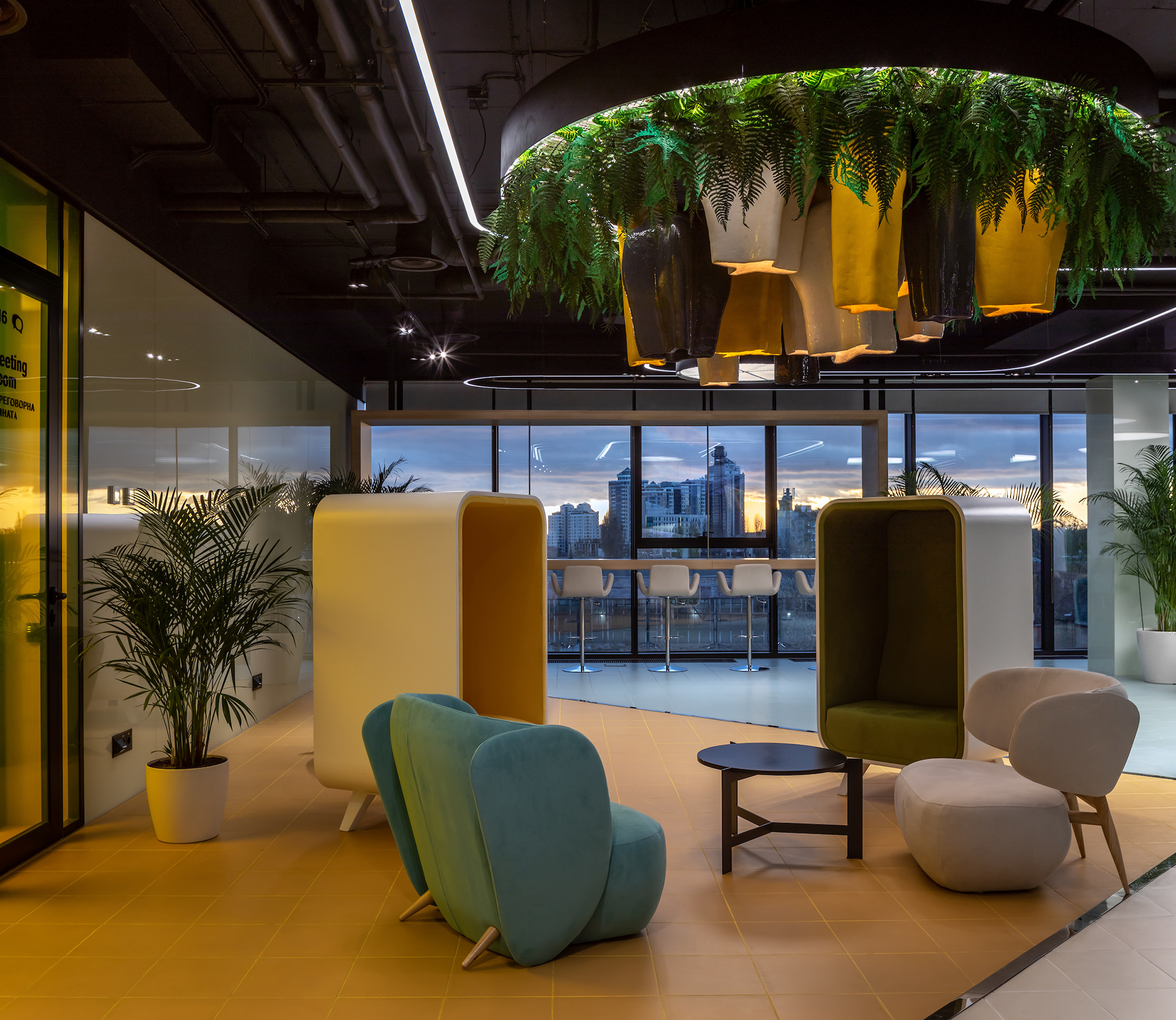 15 张 大胆黄色新公司办事处-200平方米,包括一个内部庭院,以及明亮的黄色和黑色配色方案。