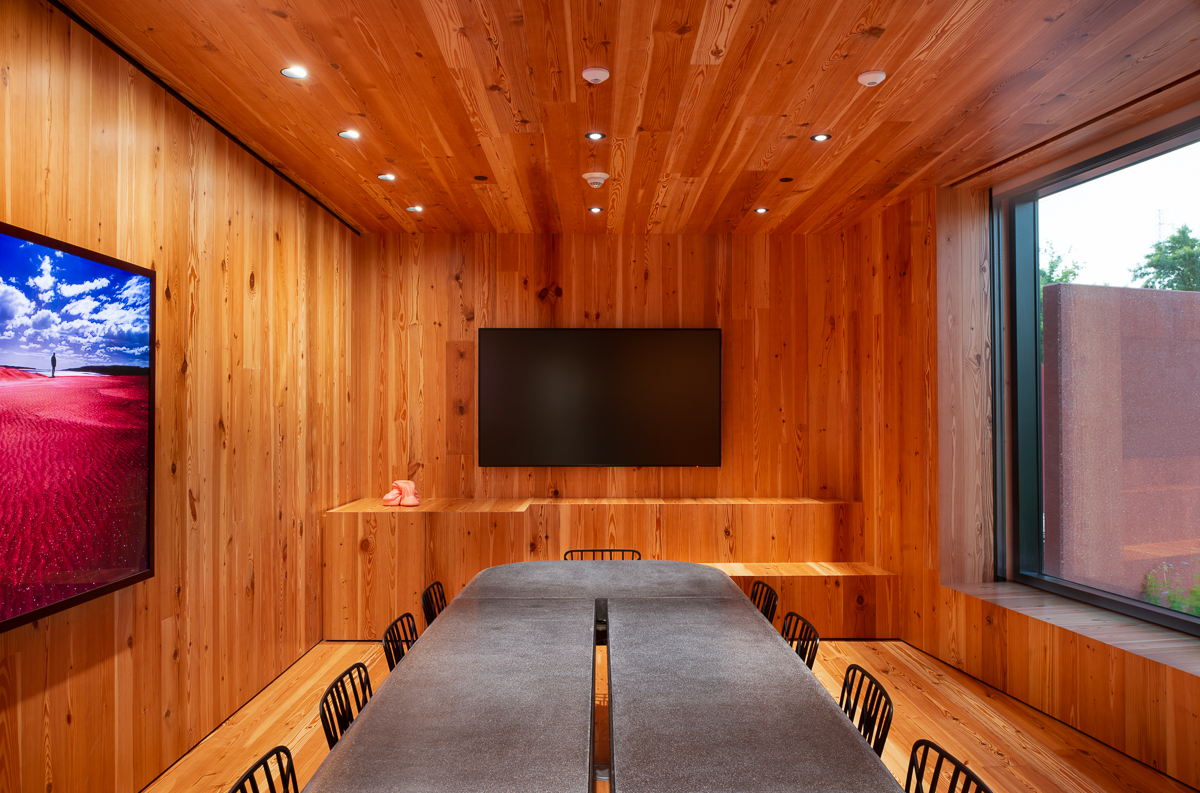 建筑师在表皮的材料选择上,挑选了于墨西哥城预制的混凝土材料,并为其涂抹了浓重的红色。建筑师还将底部10英尺的外墙,都进行了打磨,从而为路过的城市居民提供了一个较为舒适的空间感受。而剩余的外墙,则都保留了原始的粗糙之感,并安装了两种独特的红色玻璃。整个建筑,旨在给人以一种粗糙之感,但同时又完美地突出了外墙材料的粼粼波光。这种独特的对立感,也就成为了Ruby City的一个签名特征。