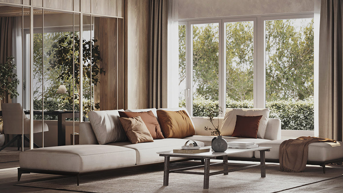 42 张 以绿色庭院为框架的灰木色调现代装饰