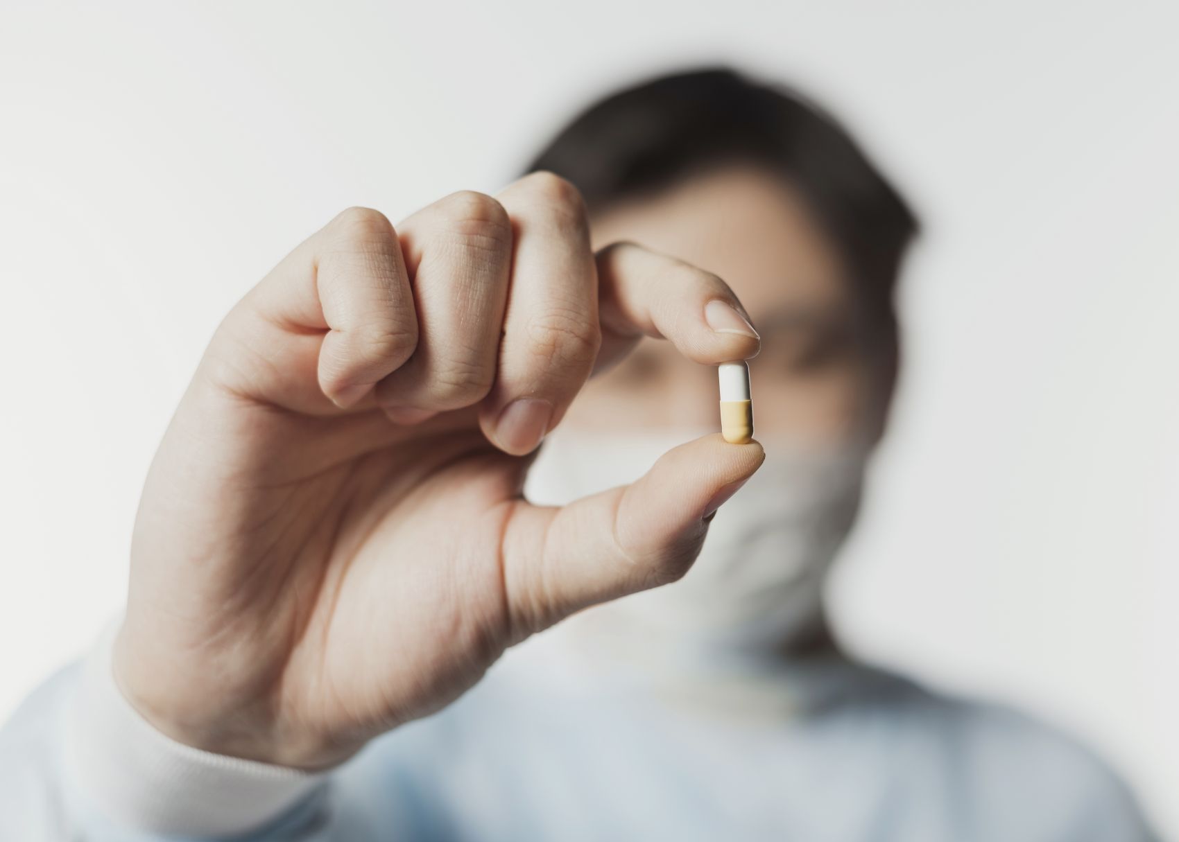 1 张 戴防护服手持红白胶囊药的医生