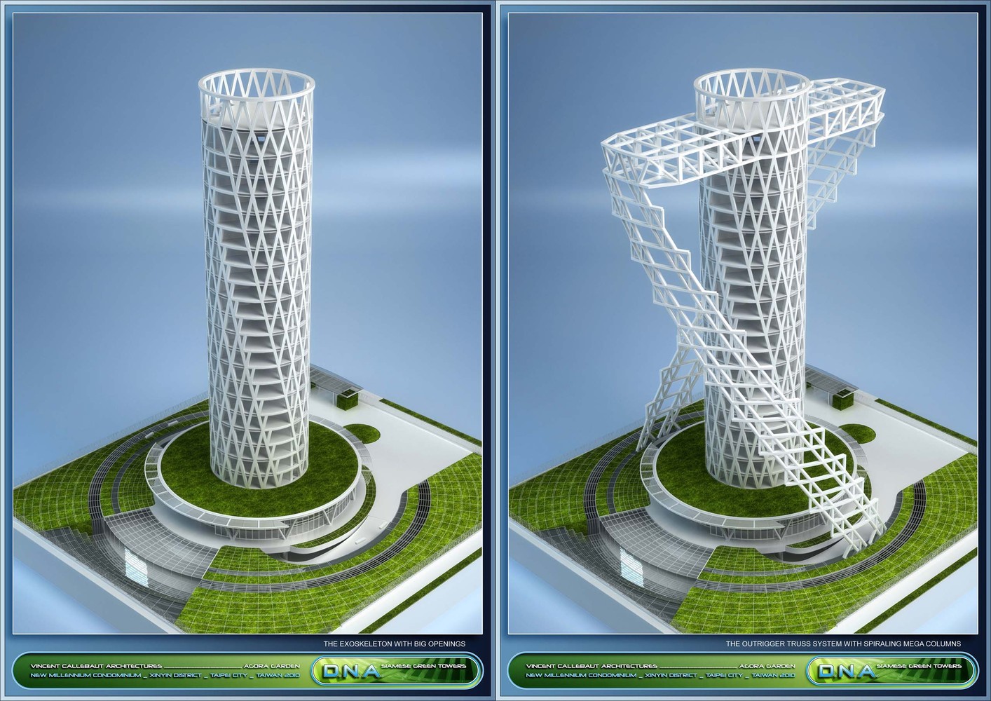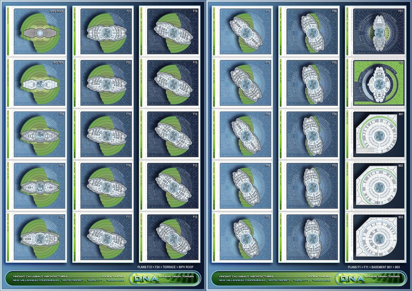住宅公寓楼的每一层都会按顺时针方向旋转4.5°,这也使得大楼在各个角度呈现出不同的外貌造型,包括V形、X形、椭圆形和锥形。建筑师希望通过这一特定的90°扭曲造型实现4个主要目标:整合大楼南北两侧的锥体区域,以遵守台北市政府所制定的城市风貌规范。 在容积率允许的条件下最大化露天的空中花园,使露台的绿植种植面积远超规定的10%。 为内部的住户提供尽可能广阔的观景视角,尤其是台北101塔和中心商业区的观景条件。 利用扭转造型所形成的特殊标准层给住户提供必要的视觉遮挡和私密性需求