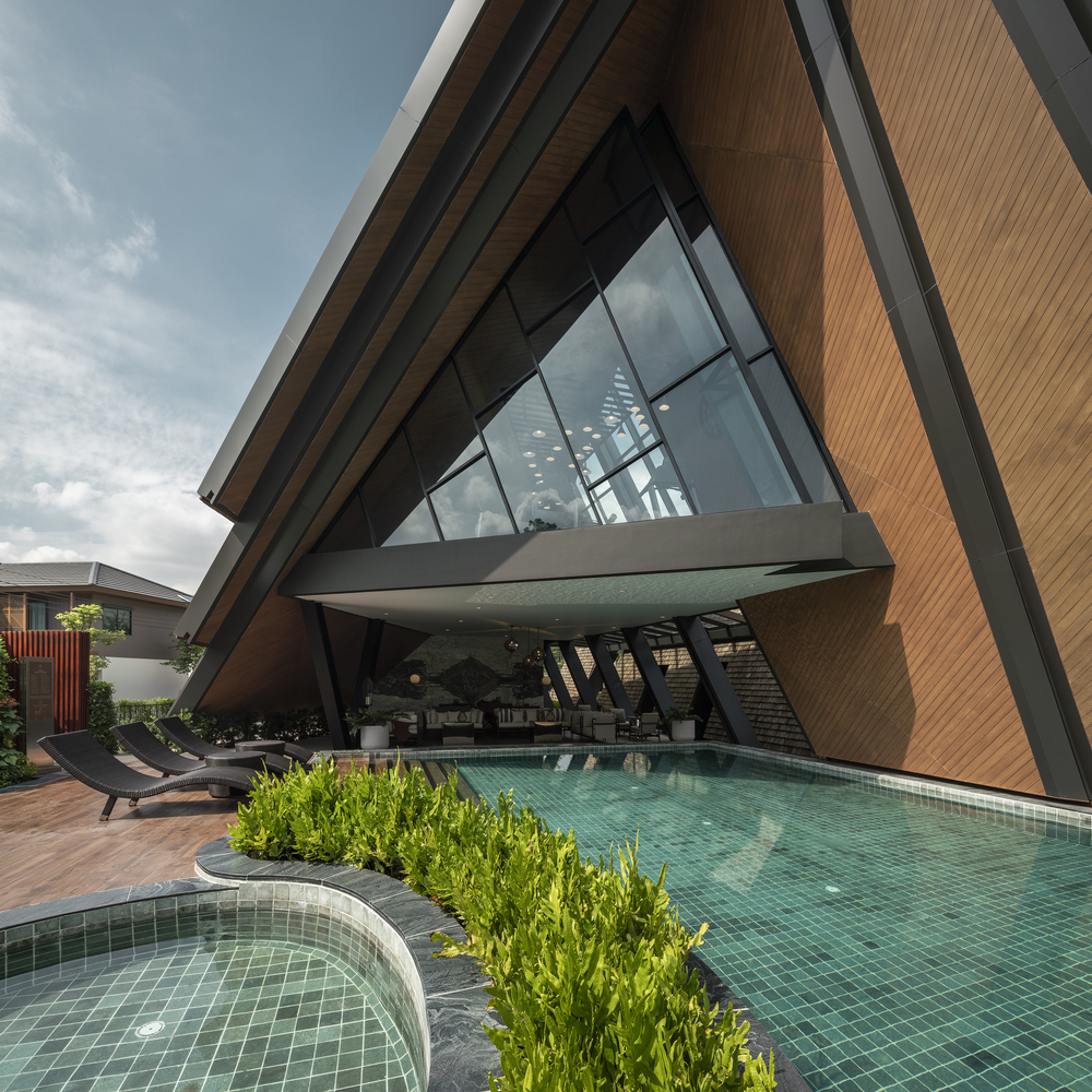 主区、大堂和健身区位于北面,全天都在阴凉处,可以看到游泳池和主公园连续和协调的景观。另一个服务区隐蔽于南侧和西侧,这是屋顶连续木墙下的主要入口。此外,建筑核心形状以纽带式交错,形成优雅的视觉视角进入建筑物,通过使用从主核心交错的斜线构成建筑元素。