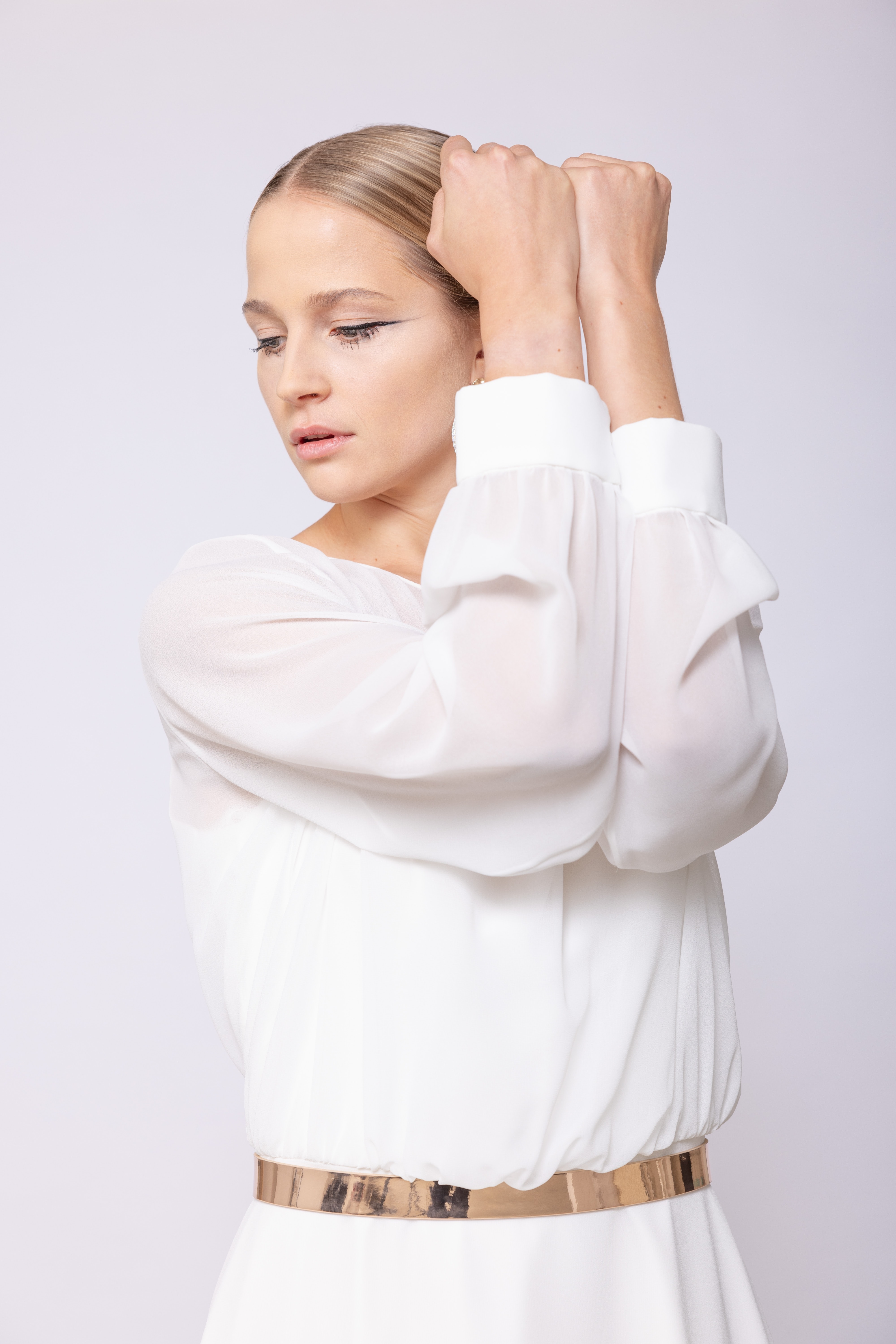 1 张 身穿白色双手举起来的金发美女