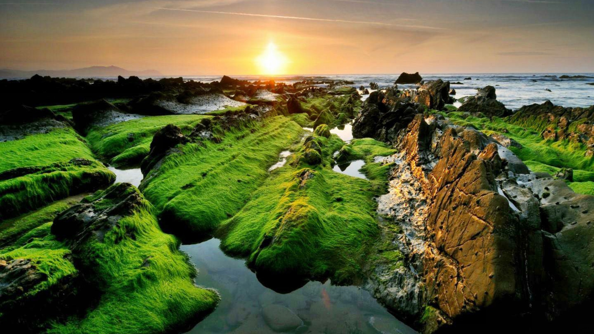 1 张 粉红色日落下的海洋苔藓岩石 : 949985