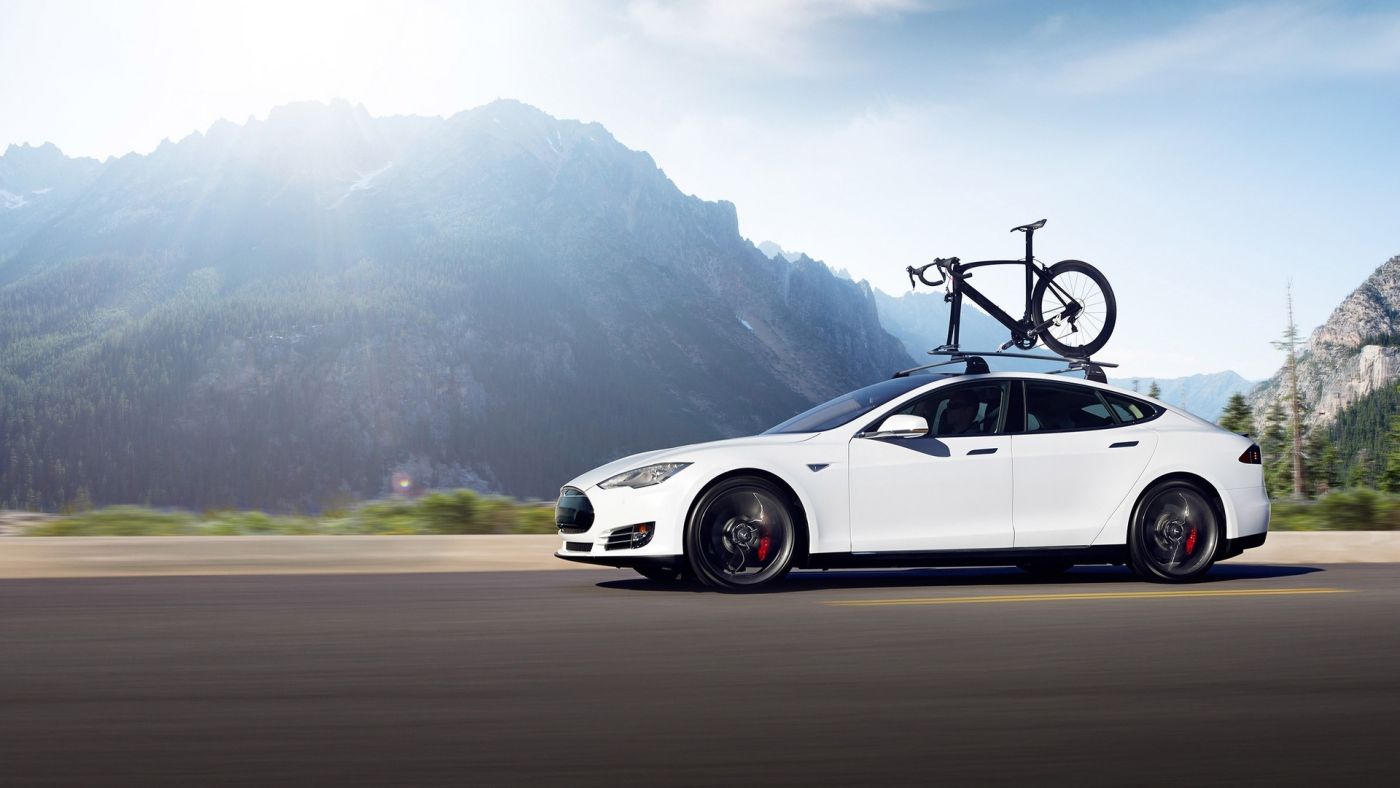 1 张 高清晰带自行车的白色tesla特斯拉汽车侧面壁纸 : 945634
