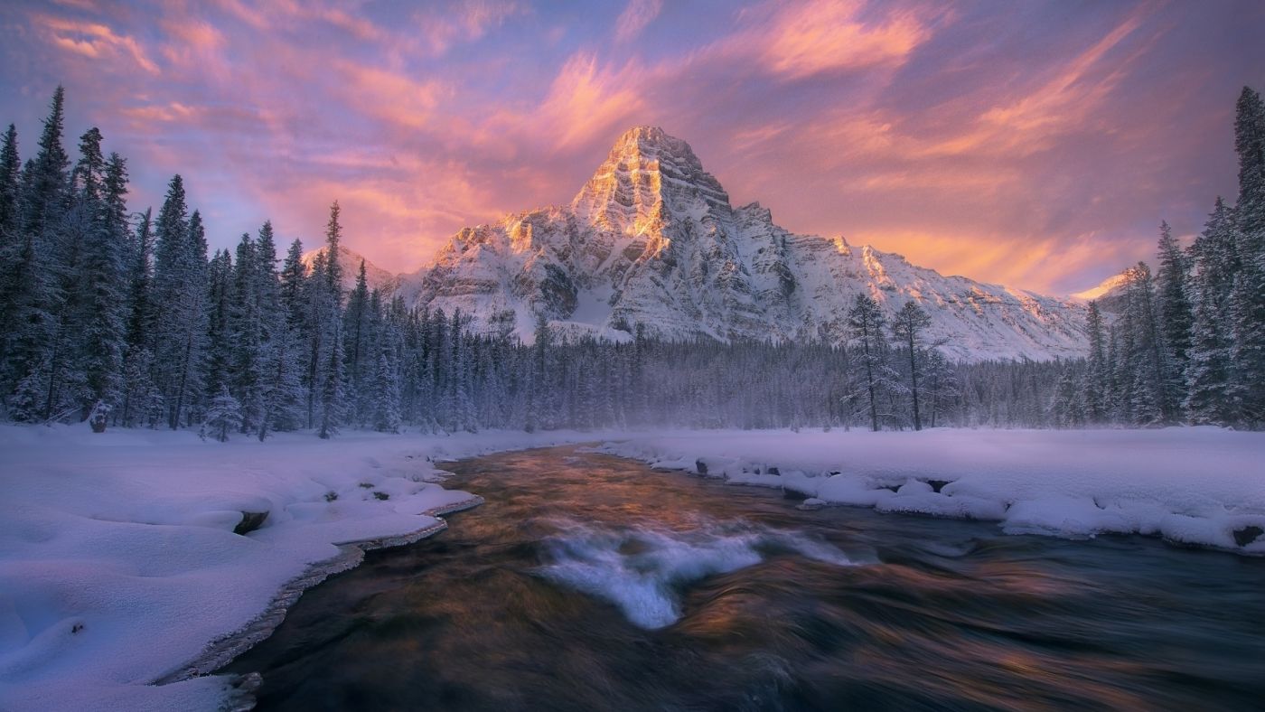 1 张 高清晰班芙国家公园紫色背景雪山倒影壁纸 : 956819