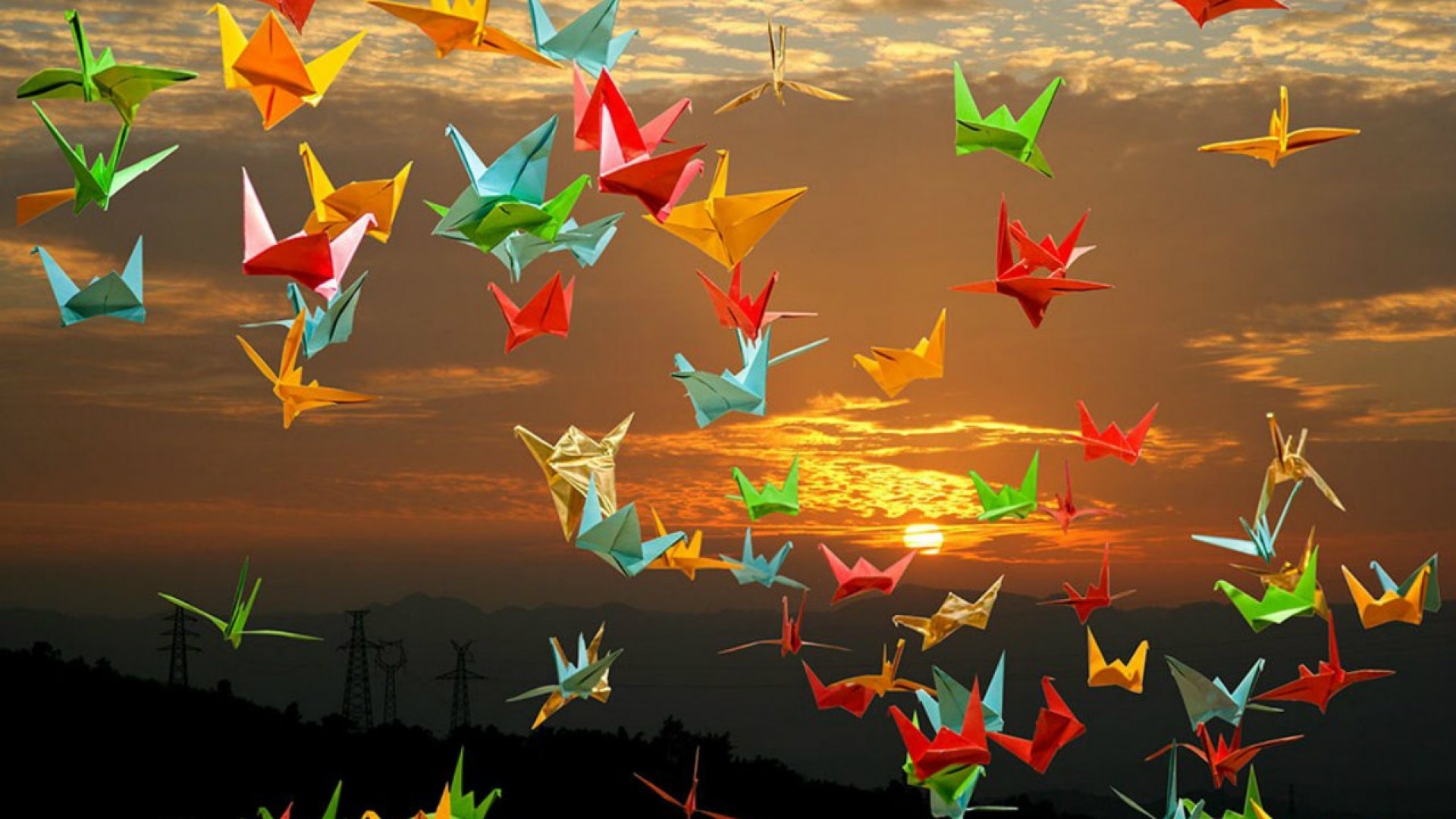 1 张 黄昏下的五彩纸鹤壁纸 : 955092