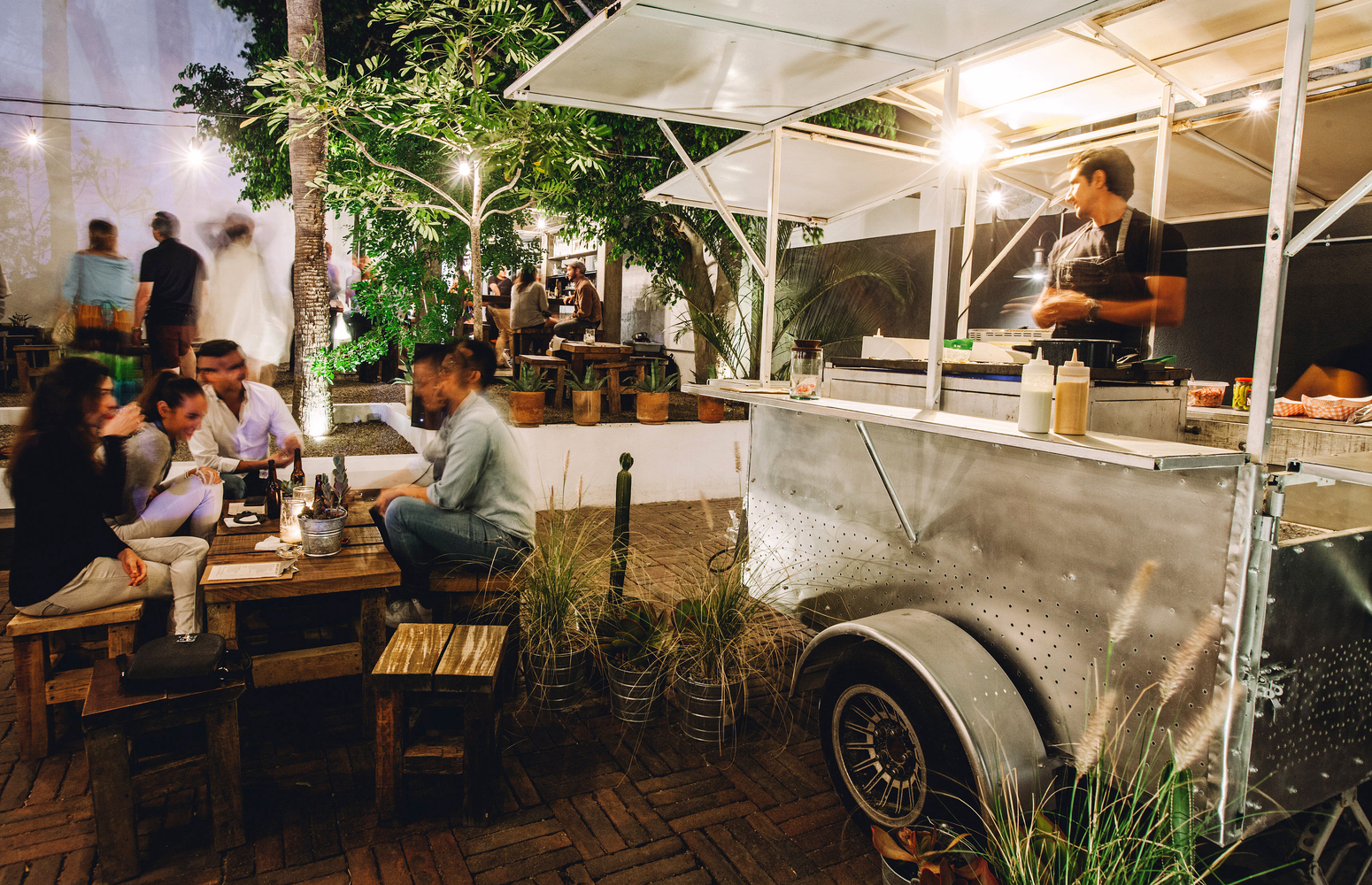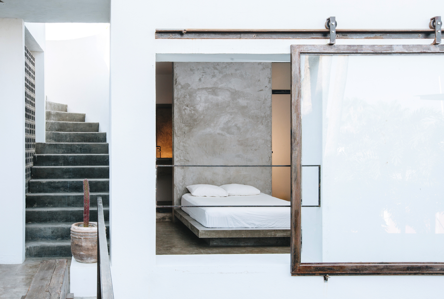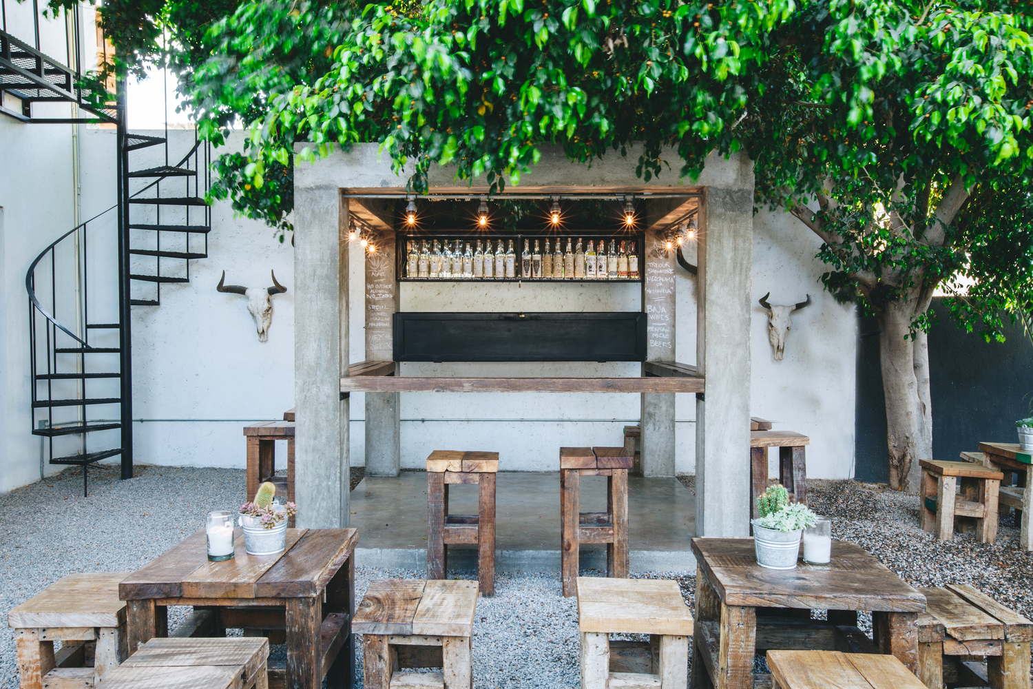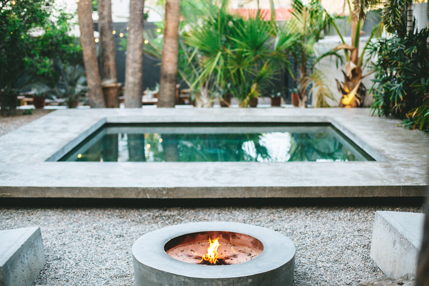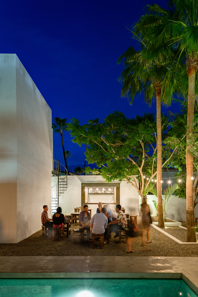 在建筑内部我们增加了隔断墙、窗以及定制的卷帘门,地板、露台、床和水槽都使用了朴素的混凝土材质。次年,我们在露天庭院中添置了火炉、酒吧和游泳池。第三年,我们在屋顶设计了一个轻盈通透的吊床塔,并且在庭院中增加了餐车和活动空间。