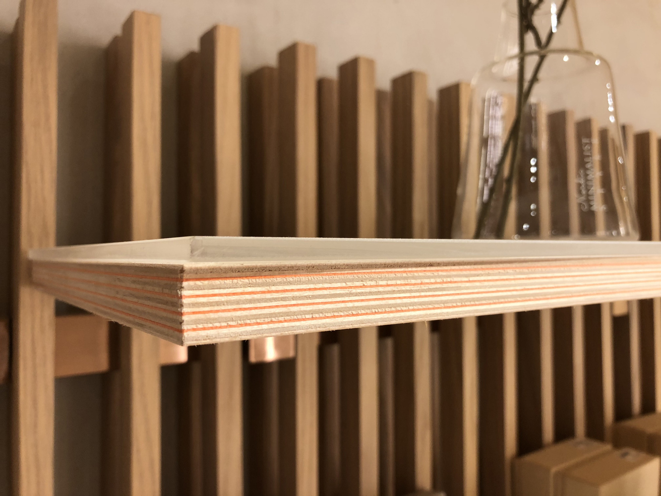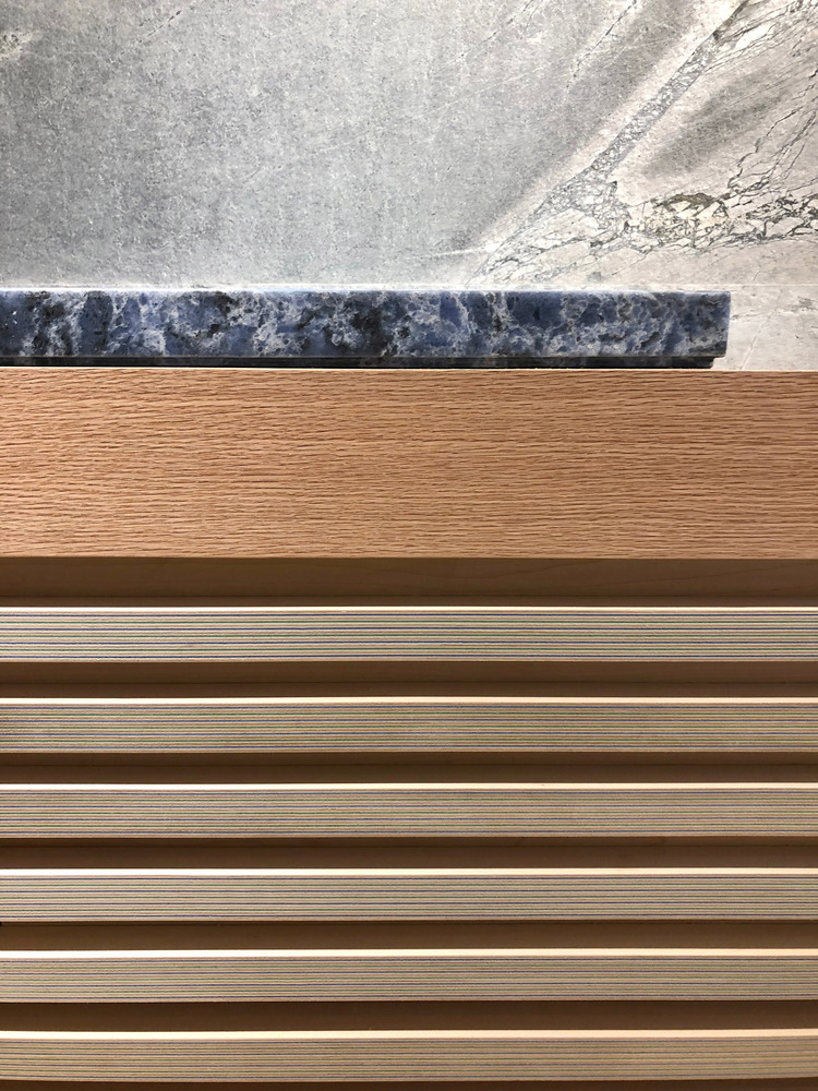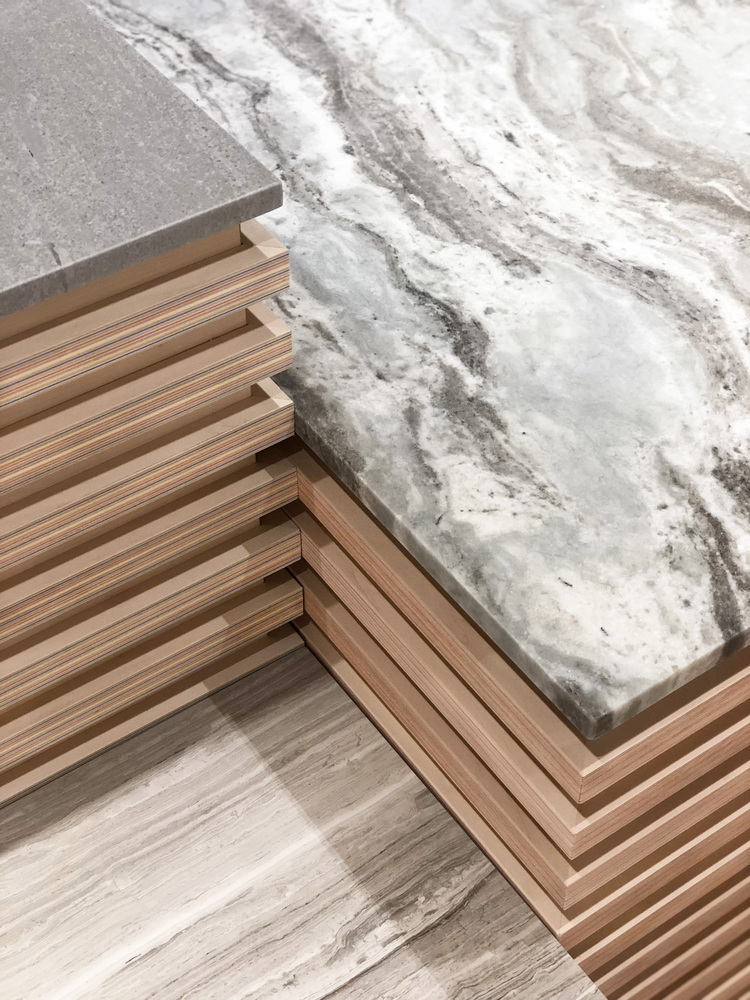 另外,STUDIO ADJECTIVE 在是次项目中使用来自日本 Plywood Laboratory 的 paper-wood 在是次室内设计项目中。此物料于北海道全人手制造,由多片北海道出产的薄木加上不同颜色的环保纸一层一层合制而成,手工专业精细,横切面非常精致美观。 ADJECTIVE 设计师特以此物料设计店内的层架以及服务台,顾客在欣赏家品的同时不难发现团队对 paper-wood 的设计及运用。