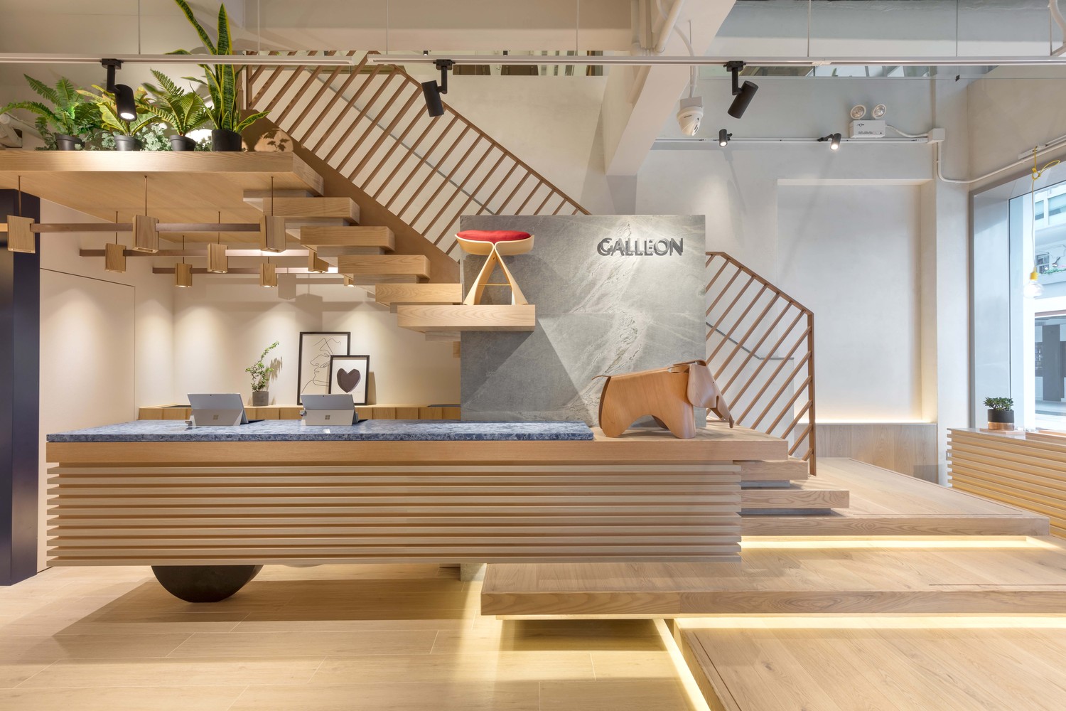 设计师特意将一楼的服务台和木楼梯设计了一个带连贯性的平台,上下两层以木平台楼梯以作连贯,在服务台正面可看到楼梯放置家具产品的延伸位置,而木楼梯同时是引领到二楼整个的潮流家品零售区, 将二楼的家品展览区和家具区巧妙地分隔同时不失整体性。