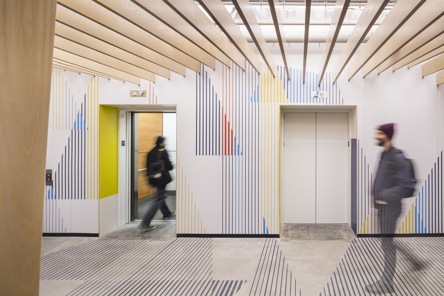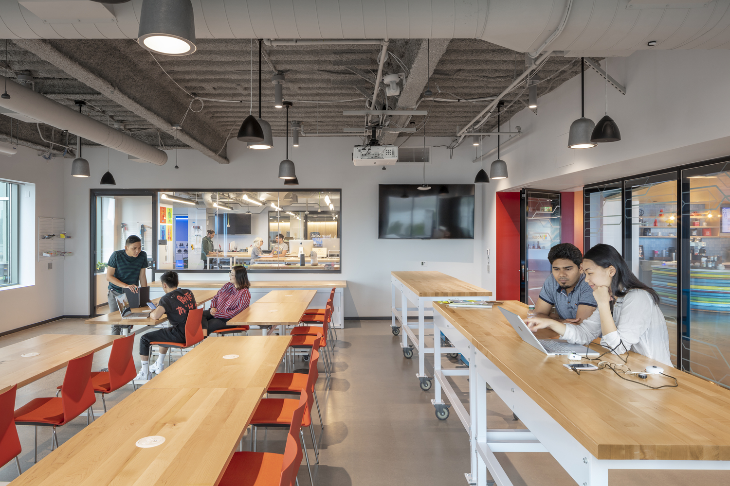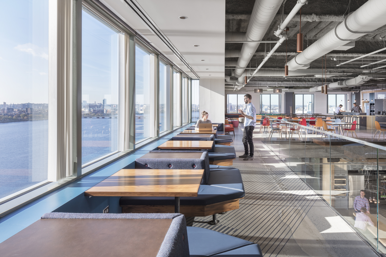 整个室内选用了多种多样温暖的、有图案的材质,独特的照明设计。使用的家具让人联想到精品住宅或舒适好客的环境而非软件工程总部。这种氛围同样延伸至主要的客户和接待区域。这一层不仅仅是一个会议空间,亦彰显了微软对于探索和创新的追求。微软的“车库(Garage)”位于建筑底层,这里同时布置了代码原型研发空间,虚拟现实和绿屏室,实习生、社区联系的空间,以及诸如“代码女孩(Girls Who Code)等伙伴关系团体使用的空间。一个配置人员的咖啡吧为这些空间服务。一个大的多功能厅毗邻这些空间,可供内部全员会议和行业活动使用。