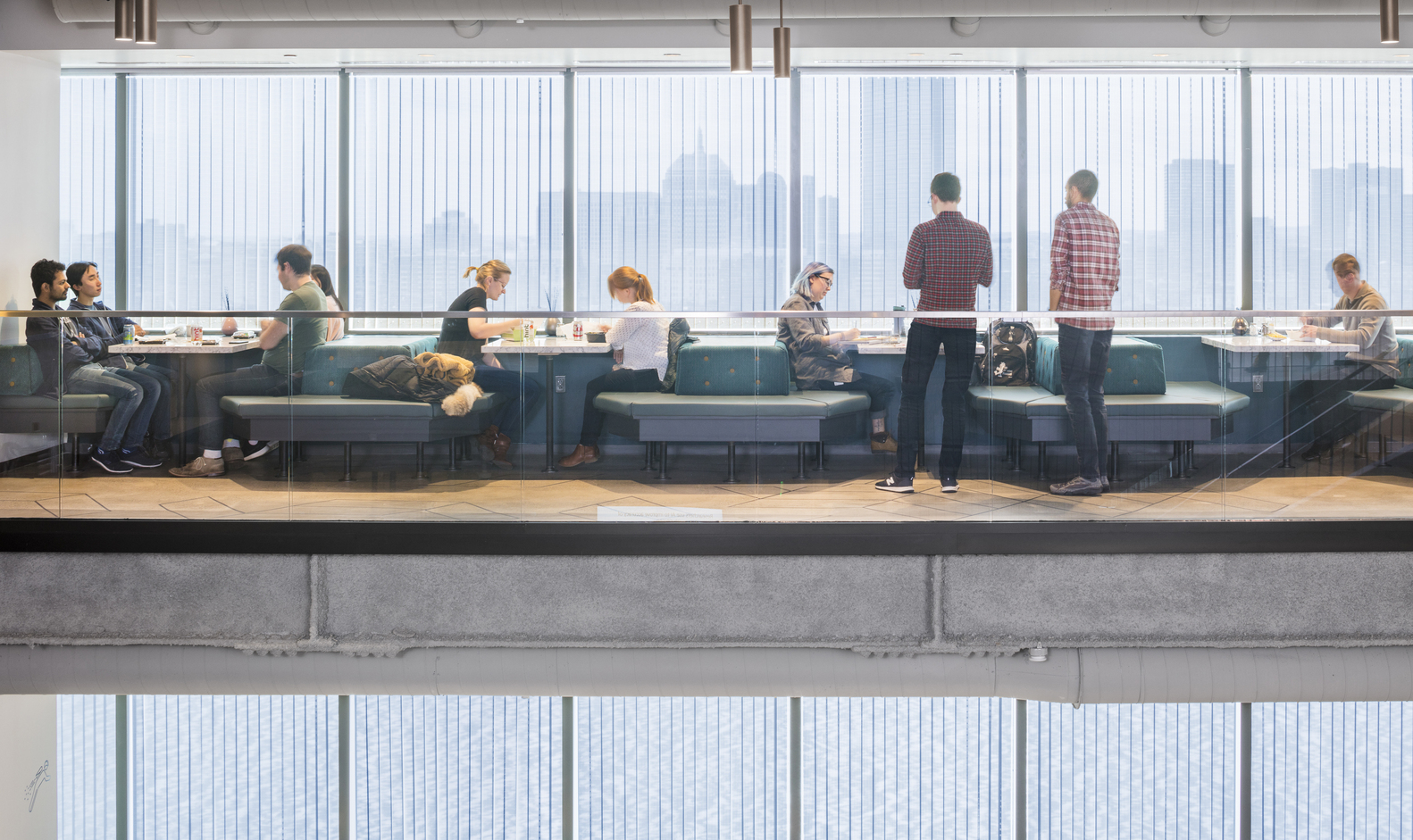 这些空间都不被任何部门所占有,它们可以快速转换为一个安静的空间。第三个层次则是主流线,它将所有团队连接起来,联系一系列分散的大会议室并且最终到达跨两层楼主社交中心。微软的空间分布于整栋建筑,其中10-11以及14-15层容纳了绝大多数工程师。社交中心将作为工程师们集聚的主要活力空间,并成为社群的焦点。社交中心也同时彰显了微软对于工作环境的全新观点,创造一个弱企业化而更加热情舒适的场所。