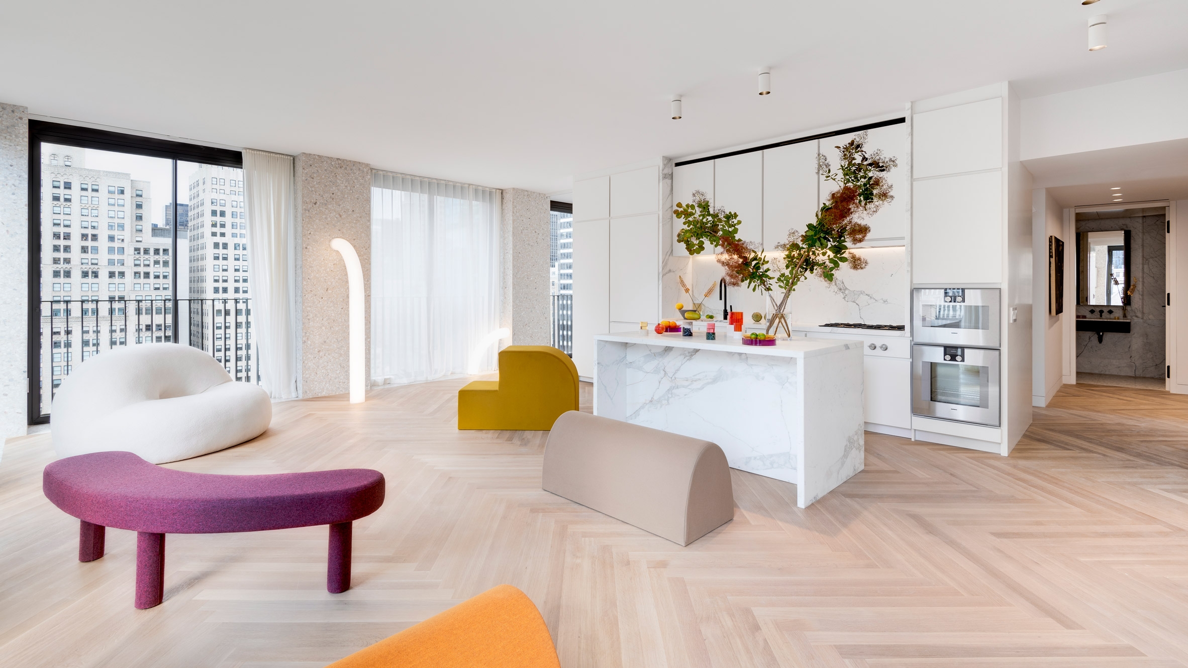 在厨房里,色彩缤纷的玻璃容器和超大的花香为白雪皑皑的白色厨房增添了一抹亮色,厨房设有大理石岛,定制橱柜和不锈钢用具。浴室内还出现充满活力色调的配饰。