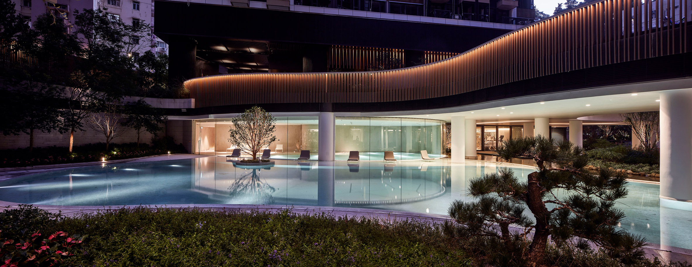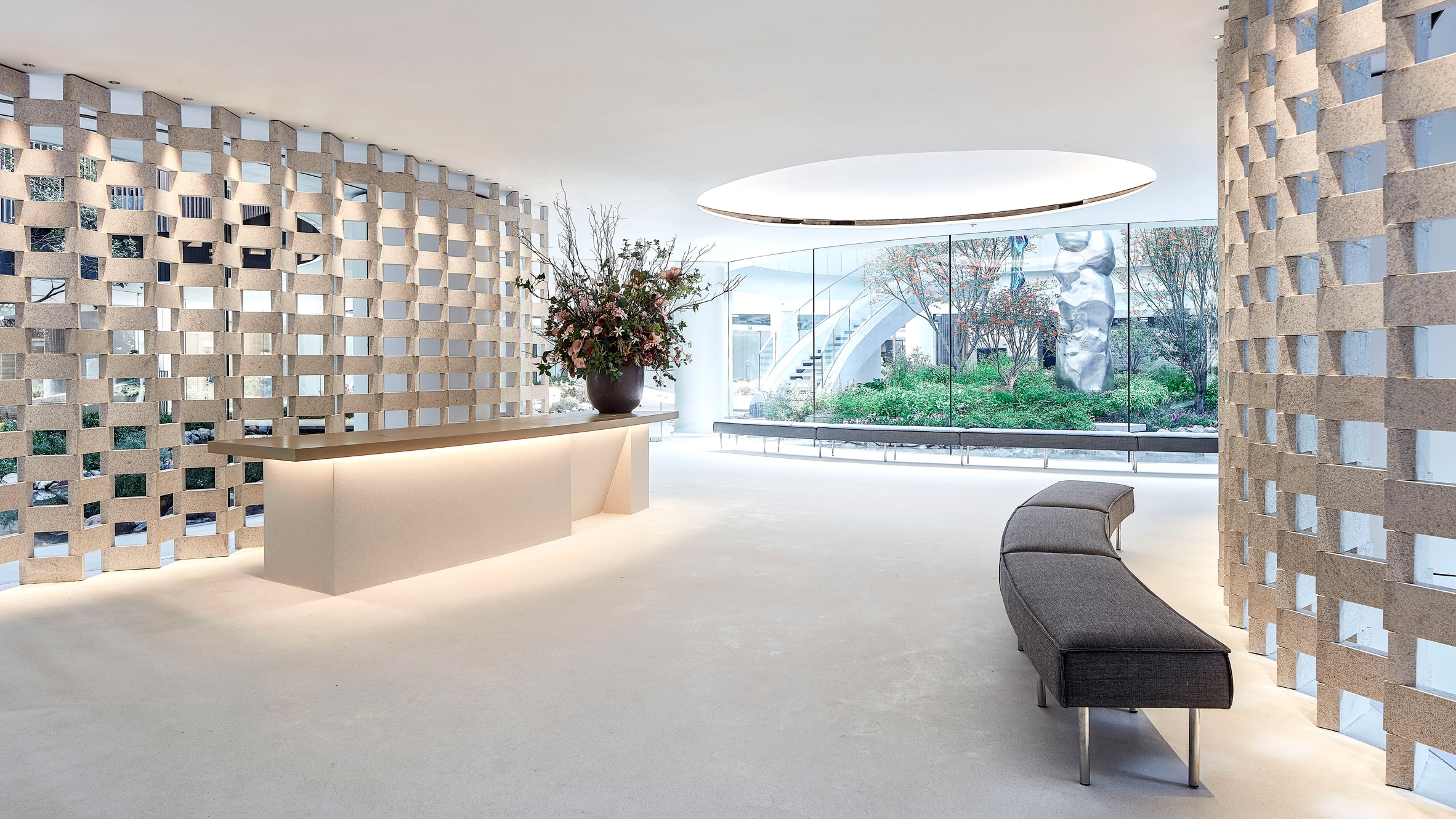 一个点缀着梅花树的青翠花园,受到日本插花艺术Ikebana的影响,大自然简化的美感和宁静感是设计理念的核心