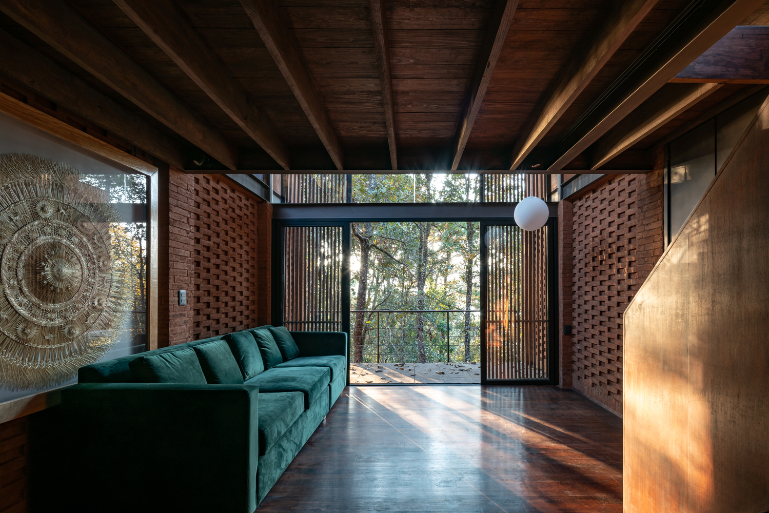 圣克拉拉德尔科布雷(Santa Clara del Cobre)位于Zirahuén镇的几公里处,我们很幸运地能与那里的铜工艺人一起工作,除了完成铜厨房的设计,还创造了浴缸和浴室水槽等铜质零件。 在日落时分,铜厨房幻化成了一盏大型的琥珀灯,照亮了主屋中的会客厅以及起居室,带给住客以温馨的暖意。