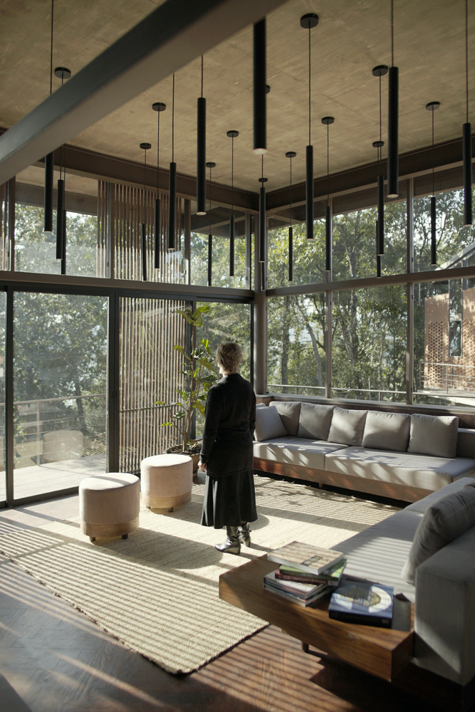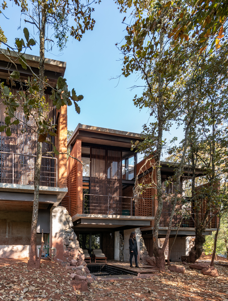 3个小屋与主屋分离,从而形成了一个中央庭院,作为项目中的一个重要交汇点。 通过设计思索,即对创造室内外的隔断使人们能从场地里的各处抵达Zirahuén度假屋的这一目标,决定了这样的功能的分区。 其中的一条步道便是私人小屋的后部通道,在这里我们能看到混凝土板屋顶的飞檐链接到场地边缘的岩石砌墙,当下雨时,雨水沿屋面流向前部,此时我们便能欣赏到水与岩石奇妙对话。