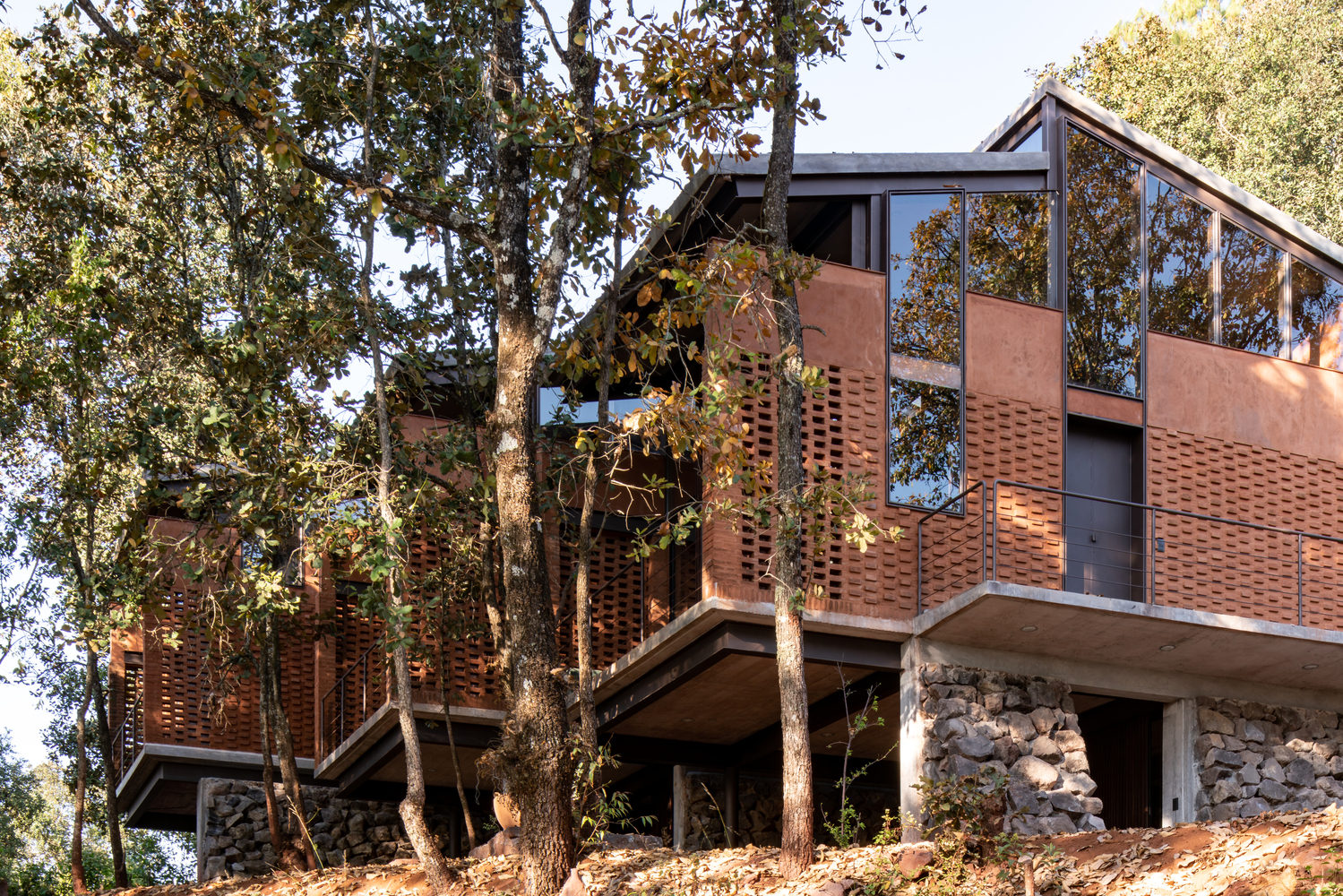 Casa Zirahuén设计的主要目的是重新塑造和解构墨西哥传统小屋,其手段是通过建筑体量方面重新构建,以及本土建造技术的创新。 我们在室内和立面墙壁上涂上了当地的名为“charanda”和“topure”的粘土涂层。 而Casa Zirahuén砖石墙的布置灵感则来源于我们在米却肯州各个城镇中看到的用以划定土地的石栅栏。 双向倾斜的混凝土屋面覆盖内部空间的同时向外延伸,创造了室外的遮蔽空间。