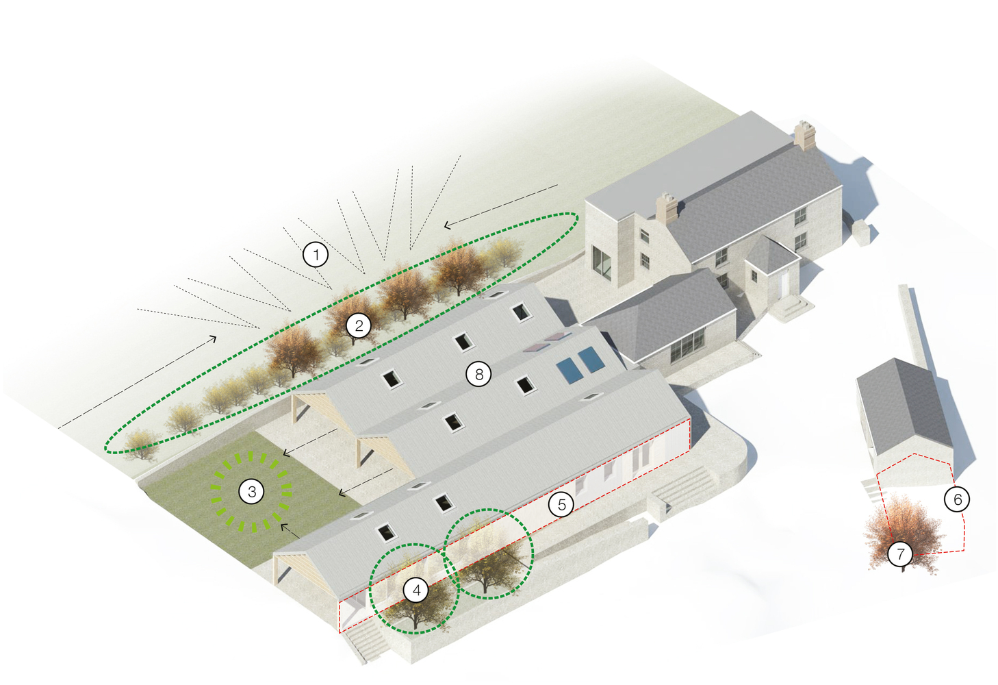 现有的地形和新种植的植物帮助从视线中阻隔主要的建筑设计元素,同时整体的空间布局又让育儿空间能连接受保护的共享的朝南的花园。