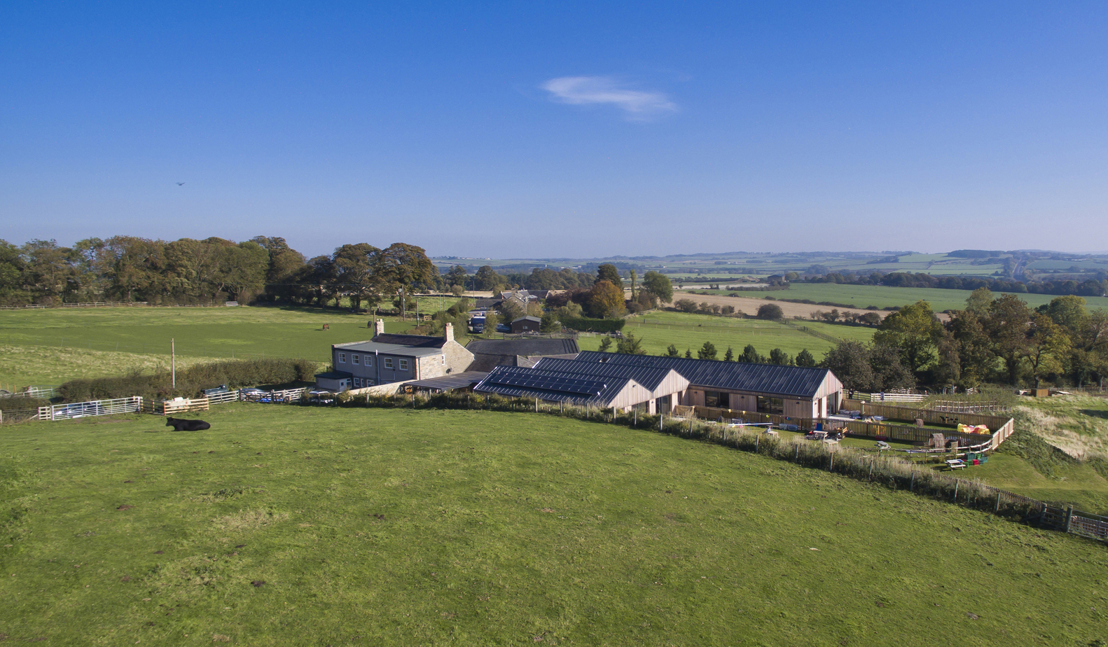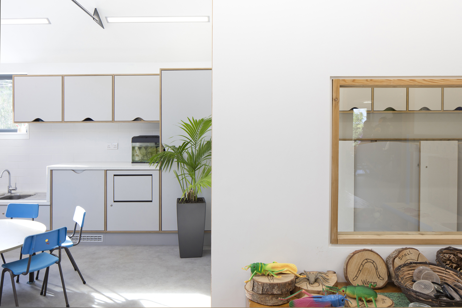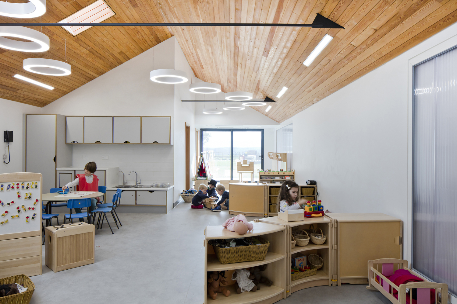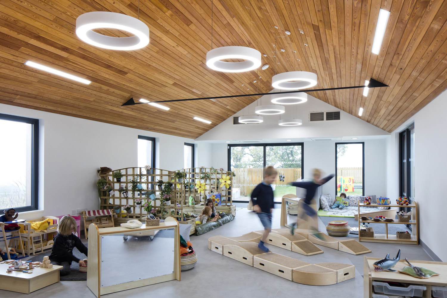 这个建筑的设计是在提供宽敞的室内空间和室外游戏空间的同时,也提供了景观框架。其尺度和形式的设计目的是打破建筑的体量,以减少对绿地的影响,利用太阳能增益和达到自然通风。