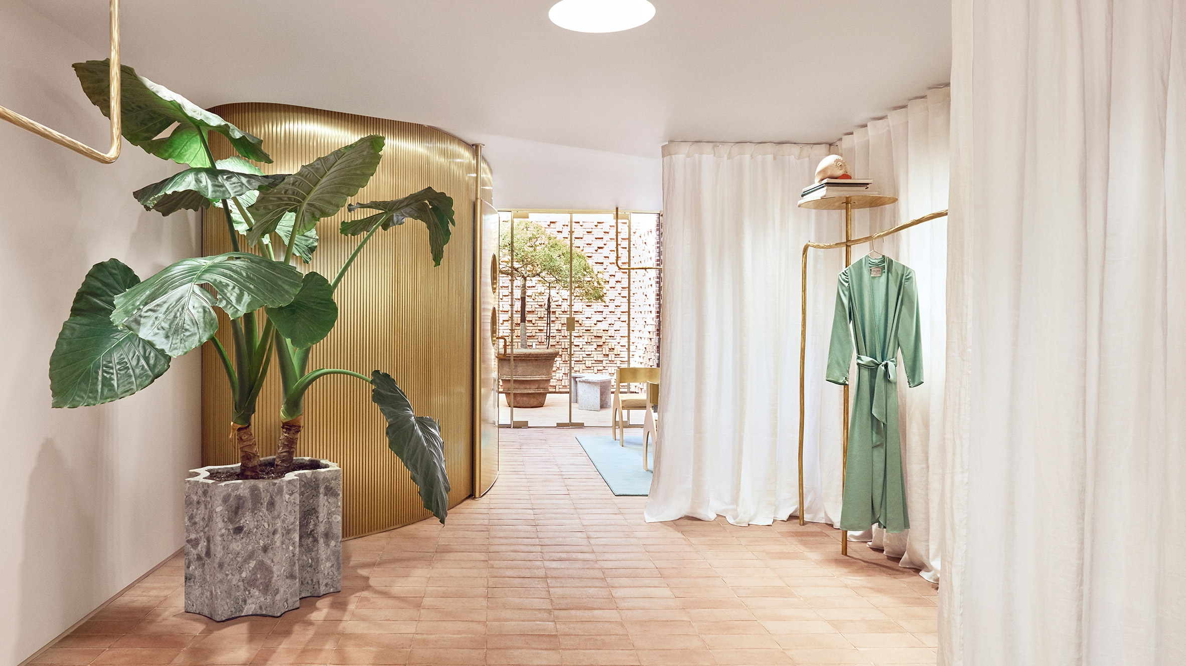 金黄色的金属还被用来制作巨大的带槽的门,可以进入更衣室。在里面,他们已经完成了缓冲墙和沉重的蓝色天鹅绒窗帘的装饰,像闺房一样受欢迎