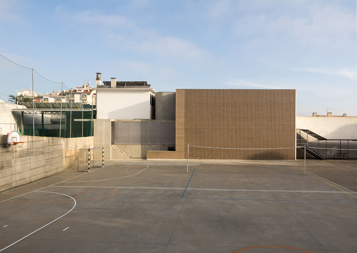 客户要求更多地使用自然通风,同时保留北向的入口,让运动场和建筑有更多的互动。建筑师选择使用渗透式的砌砖立面来满足建筑的自然通风和空气流动需求,为北向的房间提供自然采光,在保护窗户的同时,为通风装置提供了遮蔽。南向的室外的砖墙和室内围屏能有效地控制房间采光密度。