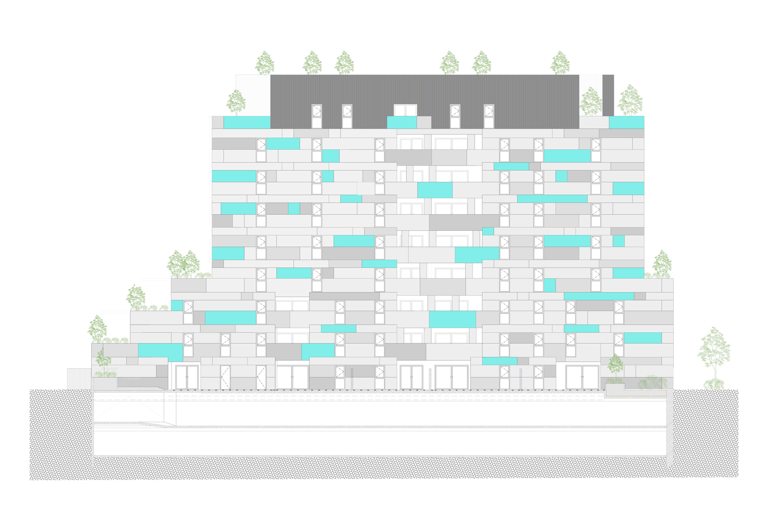 这栋公寓是一个分层的、多面性的整体,它在与街道的分界线上构成了一个城市建筑的前体。毗邻项目场地的一个公共公园将为居民提供一览无余的河流和河岸景观。这则景观带也给予公共和私人空间之间足够舒适的距离。