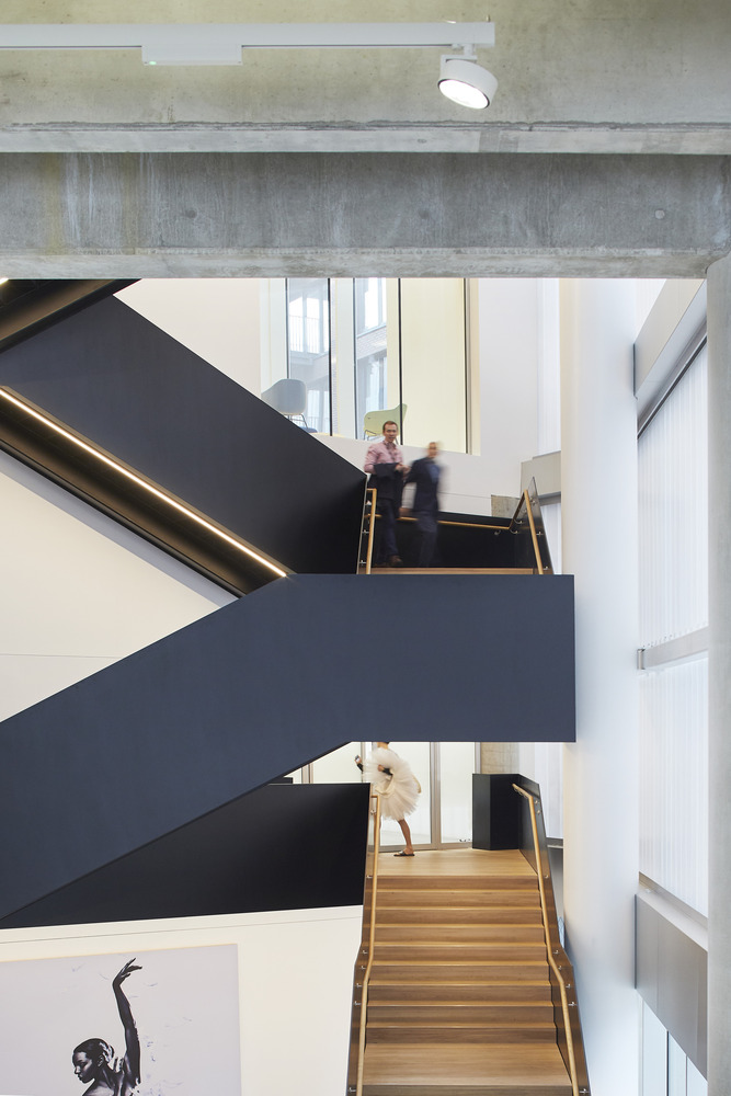 中心大楼的一层被建筑师设计成一个开放的交流空间,旨在为空间的灵魂提供栖息之所。建筑师试图通过公共咖啡厅和展览空间的设置来促进学校与公司间的交流互动。同时,建筑师在设计过程中还考虑到了后台的专业人员,为包括技术人员、建造商和服装设计师在内的各种角色提供了工作交流的场所。这种在一栋大楼内实现服道化设计生产的空间模式,在芭蕾舞演艺圈内实属首例。