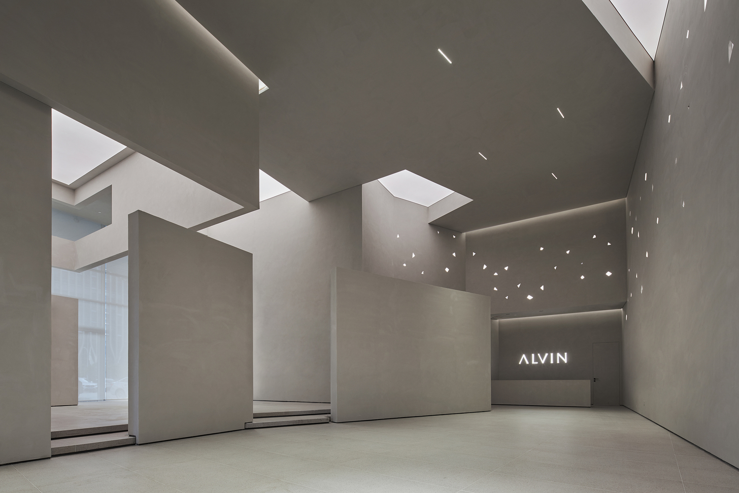 为了让空间有生命力,我们在室内模仿天光,做了不同造型的内凹灯膜,从挑高的吊顶上,照射下来就像岩洞里的光照下来一样更加空间的艺术光感和引导性。在部分的墙壁上我们设计了一些不同规则不同造型的发光孔,它就像这个空间的心脏,这些光孔我们给他命名为“星星”。每个“星星”是不同时间落差有序的缓亮缓暗,既不影响主照明的情况下,又能让浏览者看到这个空间的亮点,停留些许。仿佛在告诉着人们,这个空间是有生命的,它在呼吸,让艾尔文这个品牌有了自己的灵魂。
