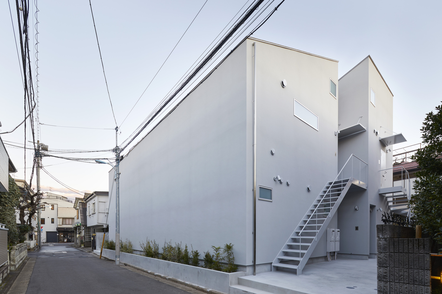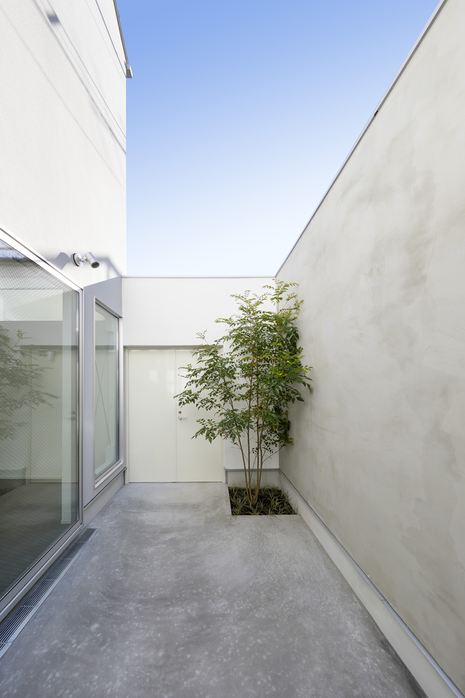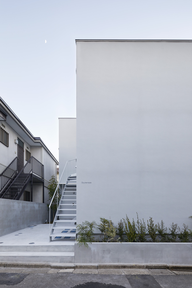 建筑封闭了面向狭窄街道及密集城市区域的立面,强调了隐私性。与这一元素相对,公寓内部带有一个开向蓝天的私人庭院。住户抬头即可看到天空,也可以在这里慢慢放松。这一独立的空间仿佛留住了休闲的时间。这也是个可以与彼此、与自己沟通的空间。