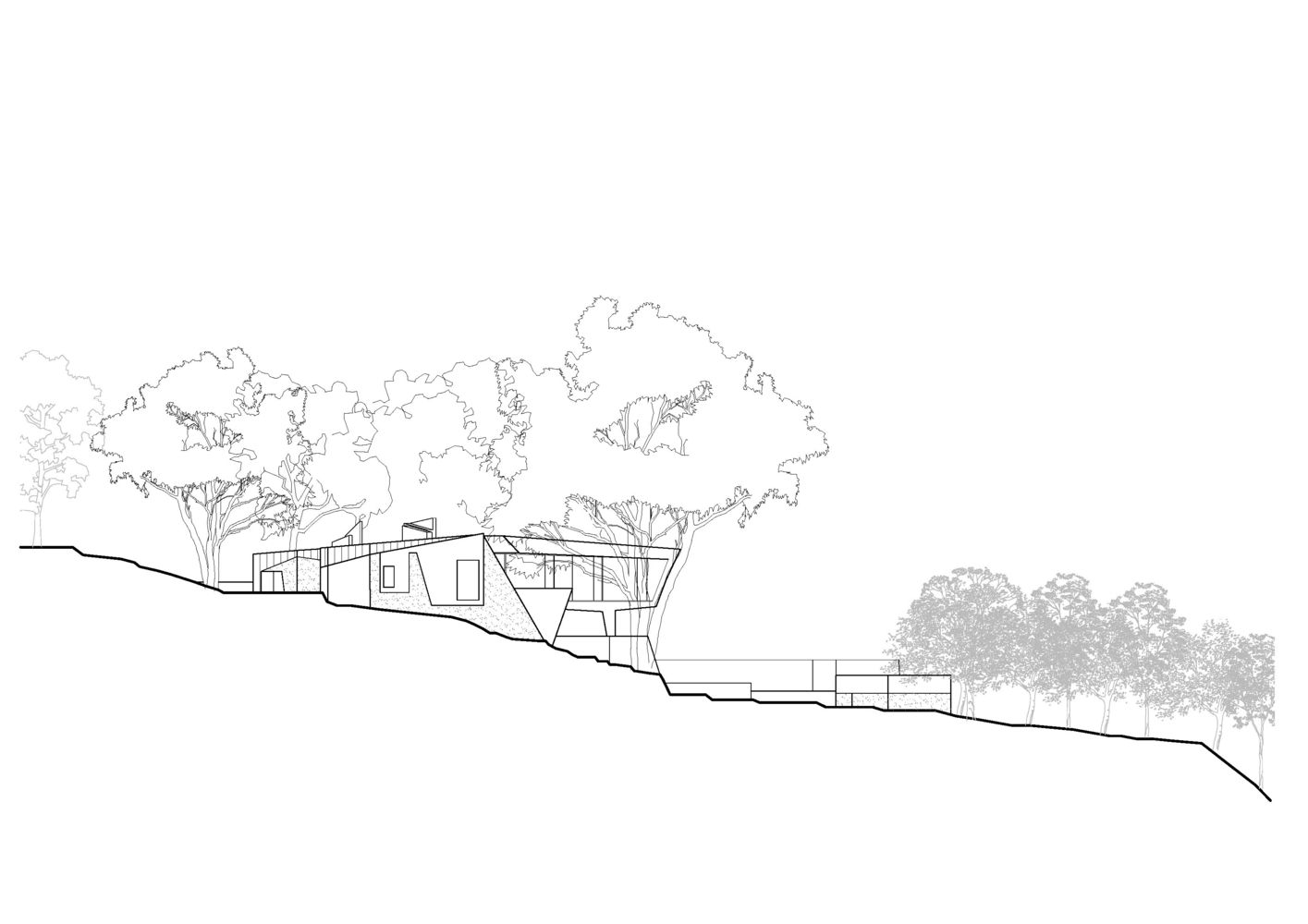 该项目位于一个典型的悉尼背景,城堡湾,陡峭的峡谷包含的支流,流经angophora丛林向下的港口。砂岩地质学无所不在,形式多样,可以从巨大的峭壁到基岩中的小波纹中体现。这些景观构造为设计提供了信息,混凝土外表的不规则几何台阶围绕着露出的岩石和变化的地形,创造了一个不确定的形式,这使该项目独特且新颖,但同样也可能会像是一个奇怪的物体在挖掘中“出土”。无论如何,混凝土元素与基地的几何形状产生共鸣,同时形成了一个为居住提供平台的建筑悬崖。