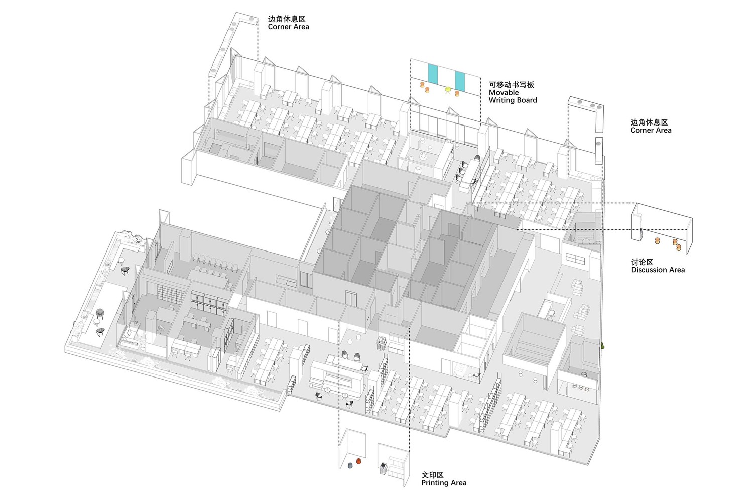 本案的空间形式介于追求极致高效的传统办公模式和推崇自由,注重交流的共享办公模式之间。以期通过点状开放的共享设施的植入,尽可能挖掘空间潜能,消除死角。这种对消极空间的激活可有效增加空间的流动性,持续激发员工对工作的热情和对办公场所的归属感,从而进一步带来对自我价值的肯定。