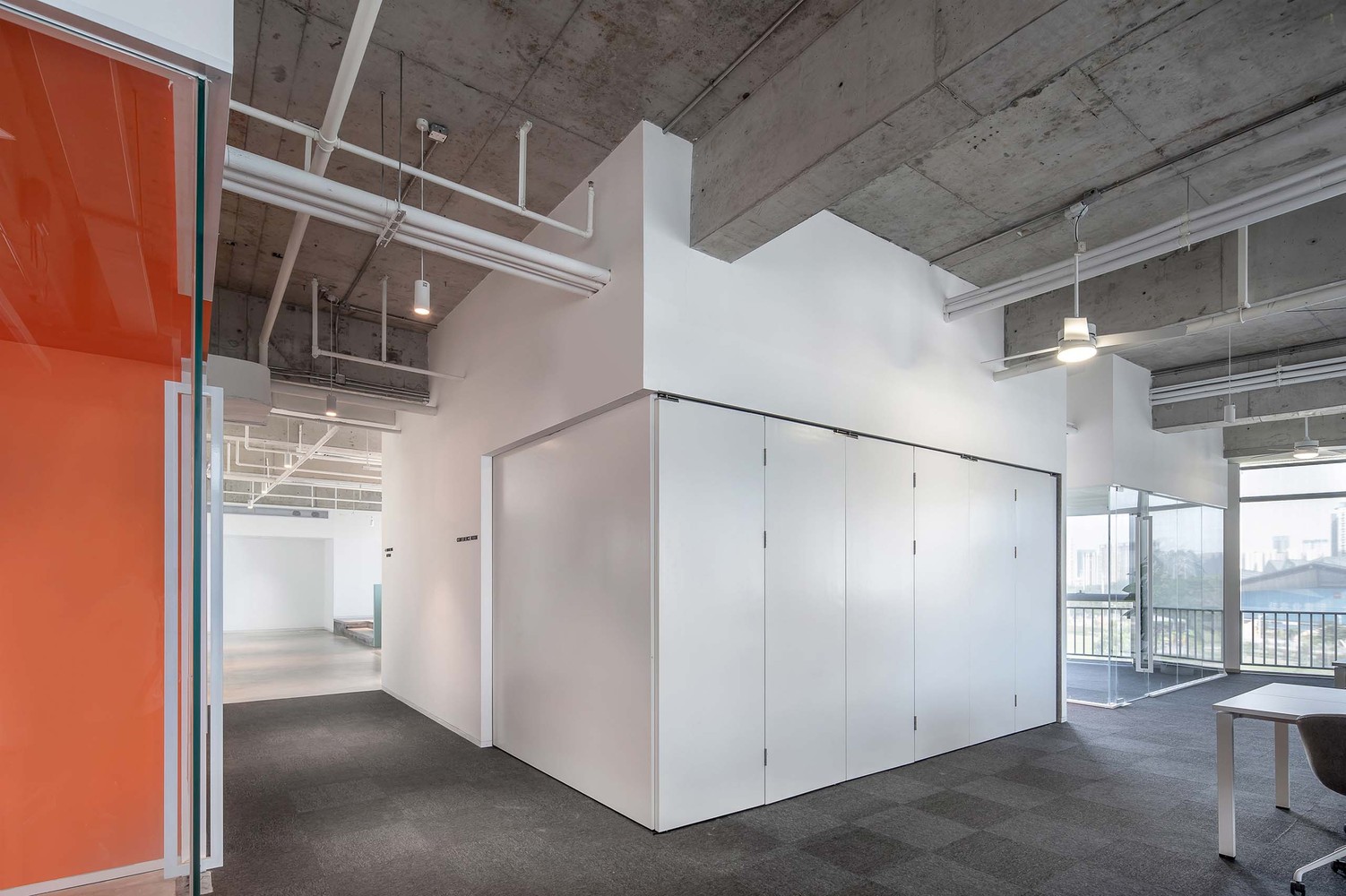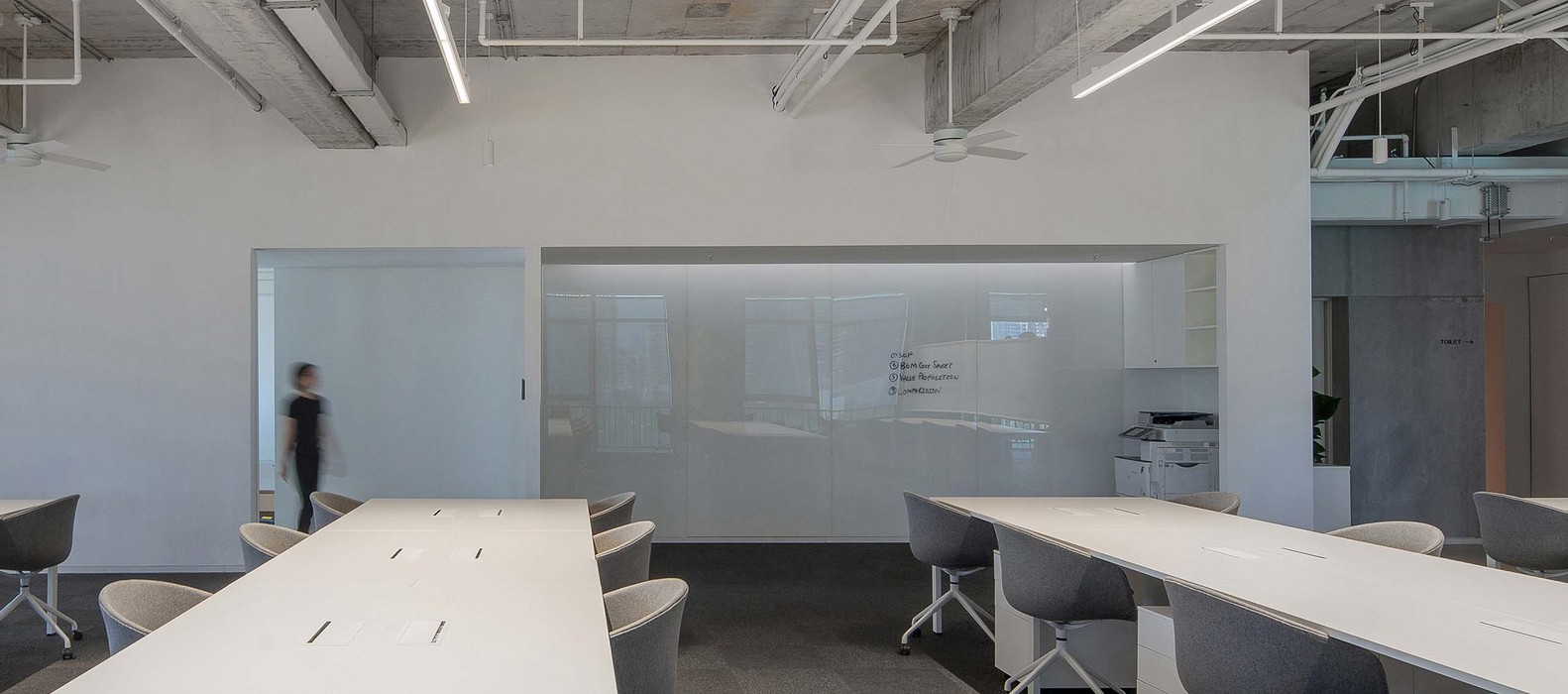 植入于入口门厅与南区办公之间的小型路演厅被设计成可开可合的白色方盒子,打开时与办公空间融为一体,可提供给员工聊天,阅读或午间休息的安静空间。推拉折叠门关闭时,内部瞬间成为独立空间,隔音措施的使用使其内部活动与外部办公互不干扰