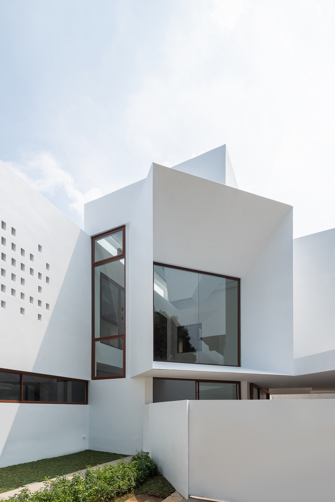 入口门廊和楼梯被设计在房屋的西侧,有一个能看到街道和公园的条窗。在此之上是一面有很多小窗洞的墙,窗洞是倾斜的,这样可以防止雨水倒灌的同时保证自然光线的进入。这面墙可以遮挡西晒而不影响室内通风。