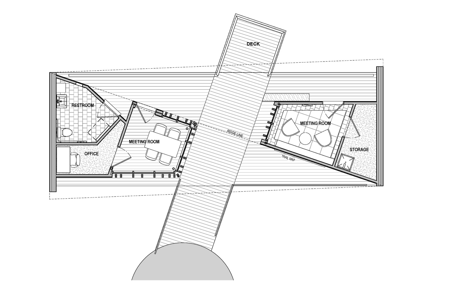 游客中心是20英亩场地中唯一的建筑,其中包含了两个小会议室,一个洗手间和一个员工用房。带顶平台为小团体提供了非正式聚会的场地,访客同时可以俯瞰周边森林和草场的全景。